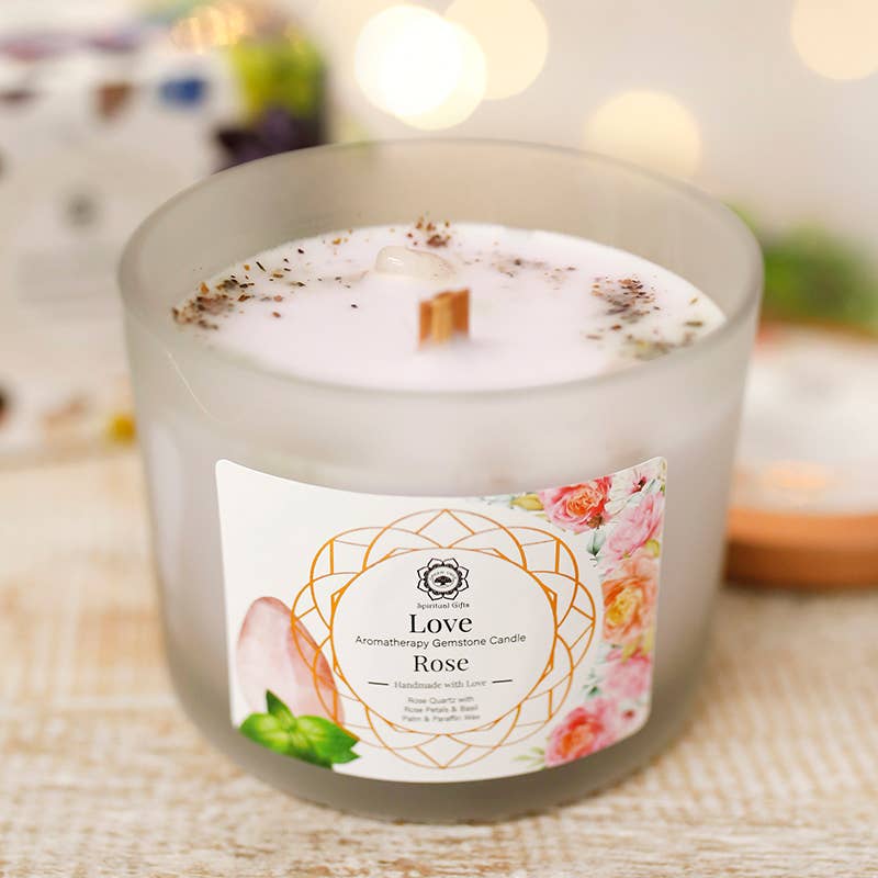 The 7 Chakra semiprecious stone candle balances body and mind through the Nag Champa aroma and the vibration of selected stones. It measures 10.5 x 7.5 cm, weighs 256 g, and is made with palm and soy wax, a cotton wick, and a glass jar with a lid. Burn time: 30-32 hours. Nag Champa calms, opens perception, and promotes deep meditation. The stones harmonize each chakra, helping the customer reconnect with their center. This semiprecious stone candle is highly valued in yoga, reiki, and holistic therapy settings. Ethike, a wholesaler specializing in candles, recommends this candle, an essential addition to any spiritual store's assortment. Wholesale only.
