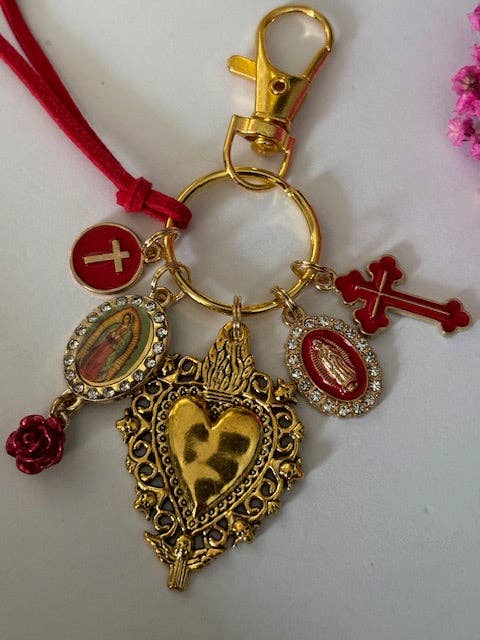 Sacred heart and cross keychain, gift for mom ex-voto, miraculous medal charm, sacred heart cross keychain, white keychain