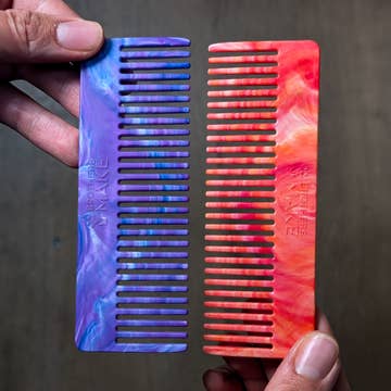 This two-sided, wide tooth comb looks as good as it feels in your hand and hair. Each side features a different pattern in pink tones.