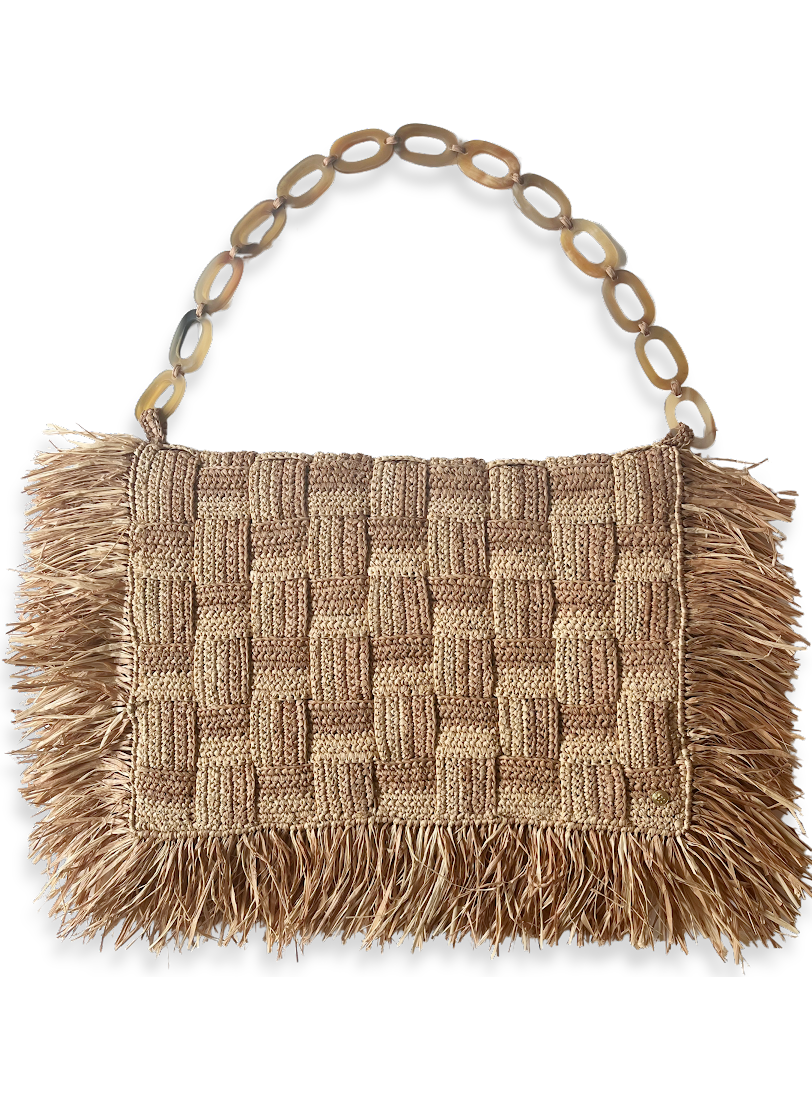 The NINA studded bag now has its miniature version! The MINI NINA is a small raffia bag with an openwork flap and studded border that can be worn crossbody or over the shoulder with its double gold chain. The appeal for the mini bag is not weakening this season. More than just a trend, the mini bag is becoming a classic and becoming a standard for our brand. The mini raffia bag is the summer accessory to spice up a day or evening outfit! Description width 15cm x height 11cm x depth 4 cm unlined magnetic closure gold stud contour flap Fabrication Natural Raffia handmade