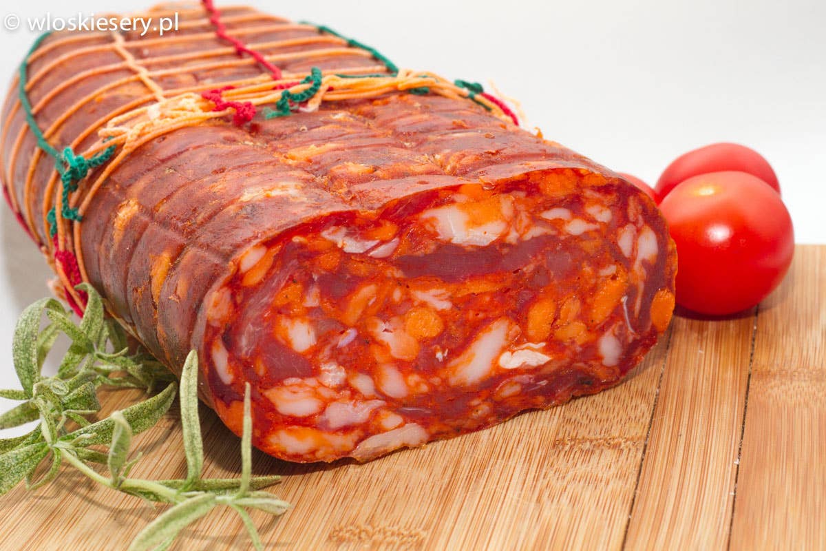 Nduja is one of the most famous, if not the most famous, among typical Calabrian food products. Nduja (note: nduja, not nduia!) is a soft, spreadable, very spicy salami. The name nduja derives from the French "andouille," which means "sausage." However, it is not a sausage, although it may resemble one. Nduja is made with pork, a bit of fat, and a lot of hot chili pepper. It is precisely because of the abundant chili pepper that nduja is very spicy. It is no coincidence that someone might prefer a "light" version. Nduja has a reddish color - needless to say - due to the presence of chili pepper, and a consistency that does not become hard even after aging. Sold in 2 or more vacuum-sealed packages. Product subject to a 15% weight loss. Product shipped in a freshness-saving bag. Compliant with EU regulations.