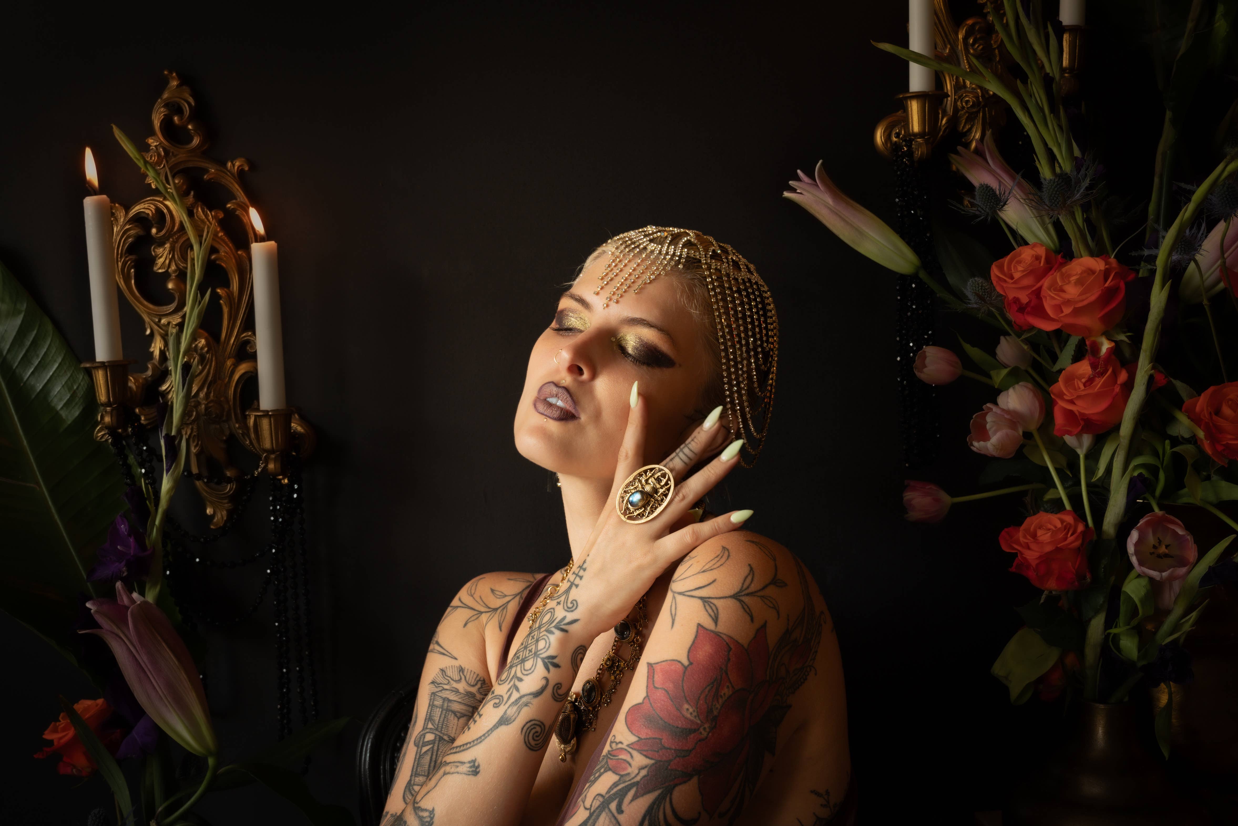 This serious collar evokes Kundalini - that essential life force that rises from the base of your spine to the top of your head when you die or are in an advanced meditative space. Inspired by Byzantine jewelry, this lavish medicine collar features a coin-style design decorated by fierce faceted black onyx, spinel beads and, of course, labradorite cabochons that hold the secrets of intuition. Neckline, 27” with signature clasp 3” adjuster -Tooled brass, pewter and cast bronze with antique gold and brass finish -Labradorite -Rhinestones -Onyx -Spinel