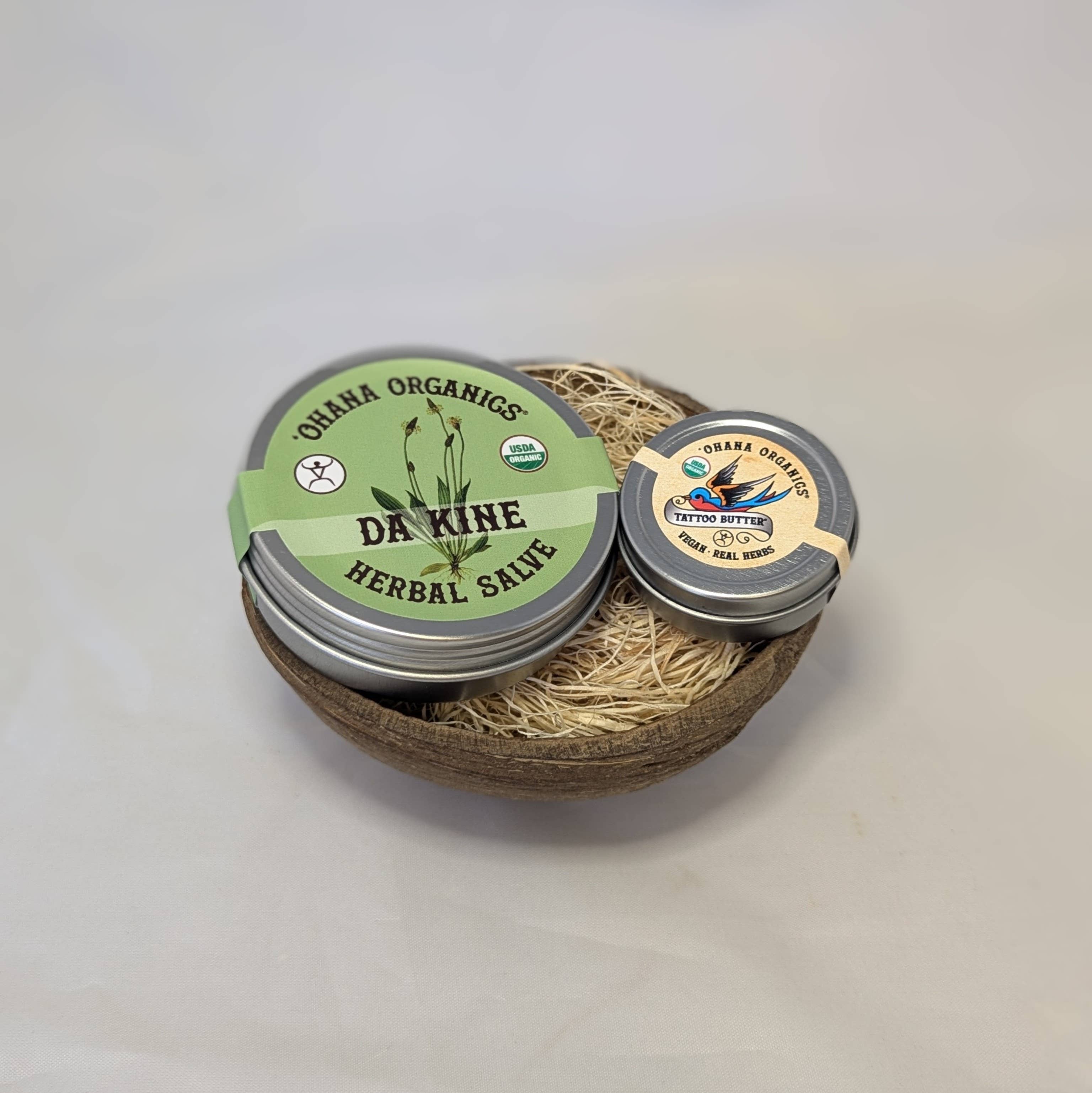 Finally, one kit to help clean and heal your fresh tattoo. Our all-natural Tattoo Cleanser and certified organic Tattoo Butter is the perfect gift. Our Cleanser comes in a foam pump and is made with anti-inflammatory and antiseptic herbs to freshly clean without drying out the skin. Follow up with our award-winning Tattoo Butter to help soothe and heal from the inside out. Made with real herbs and fair trade shea butter, this vegan, organic cream is all you need for the life of your tattoo. Kit includes: 2oz Tattoo Butter tin or 2oz jar, 1.7oz Tattoo Cleanser Choose from a reusable plastic or Natural Fiber bag Tattoo Butter: Fair Trade Shea Butter*, Olive Oil*, Lavender*, Calendula*, Plantain*, Aloe*, Vitamin E Lavender Tattoo Butter includes Lavender Essential Oil* Cleaner: Castille Soap (Water, Coconut Oil, Sunflower Oil, Castor Oil, Potassium Hydroxide, Citrus Acid, Rosemary Extract)*, Distilled Aloe, Witch Hazel*, Lavender*, Rose*, Rose Water*, Vegetable Glycerine. *Organic