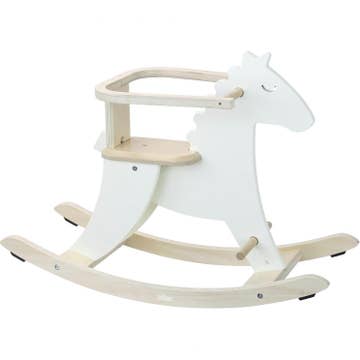 Lucky Rocking Horse by Tender Leaf Toys A wooden rocking horse for toddlers to enjoy, a traditional toy with a contemporary twist. A premium rocking horse inspired by the classics. A traditional and essential toy for the nursery or playroom. Simple and chic, painted in white with details in natural wood. Presented in an illustrated colour box. Crafted from sustainably sourced rubber woo - SVLK -Indonesia’s Timber Legality Verification System Suitable for 12 months+ Product dimensions: 71.5 x 28.5 x 55.5 cms