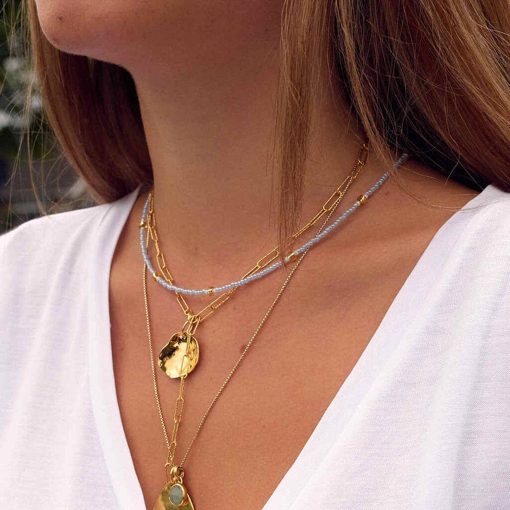 The Aramis Beaded Necklace in Malachite is for the woman who views her jewelry as an essential part of her expression. She likes to have lots of jewelry in her wardrobe, to layer with purpose, and knows how to use color! In our spring collection we’ve focused on the hues of coastal trends that your customers will be loving this season. The Aramis pairs the natural glow of malachite with the subtle shimmer of sliced gemstones. It's versatility and color options make it a brand best seller. It's dramatic length lends itself to mulitiple layering options. Adjustable for versatility, it’s a timeless piece that transitions seamlessly from casual to formal settings. We have partnered not only with Anthropologie, Anthropologie Europe, and Sundance, but 600+ additional retailers nationwide, and we’d love to partner with you next! Hypo allergenic, natural stones, 50" length with lobster closure and end chain to adjust the length.