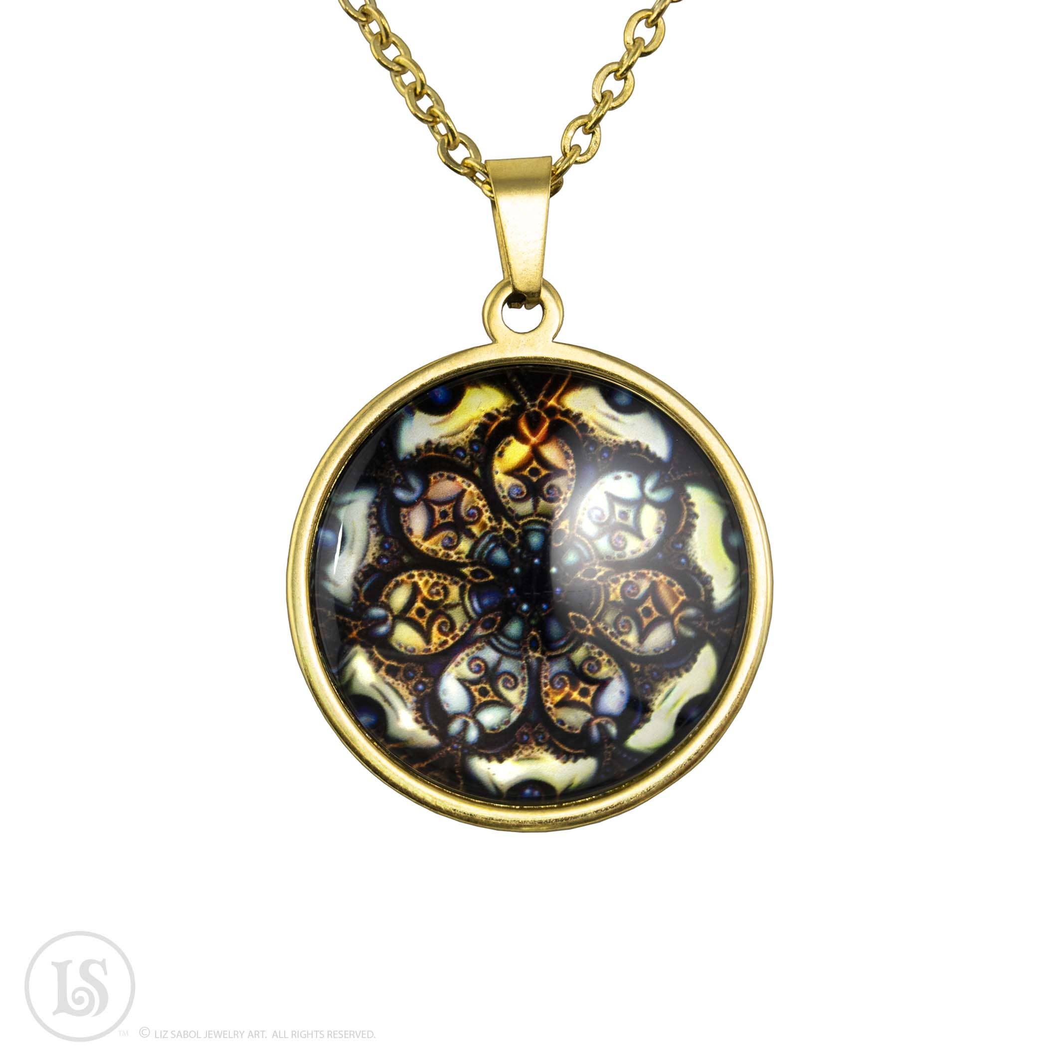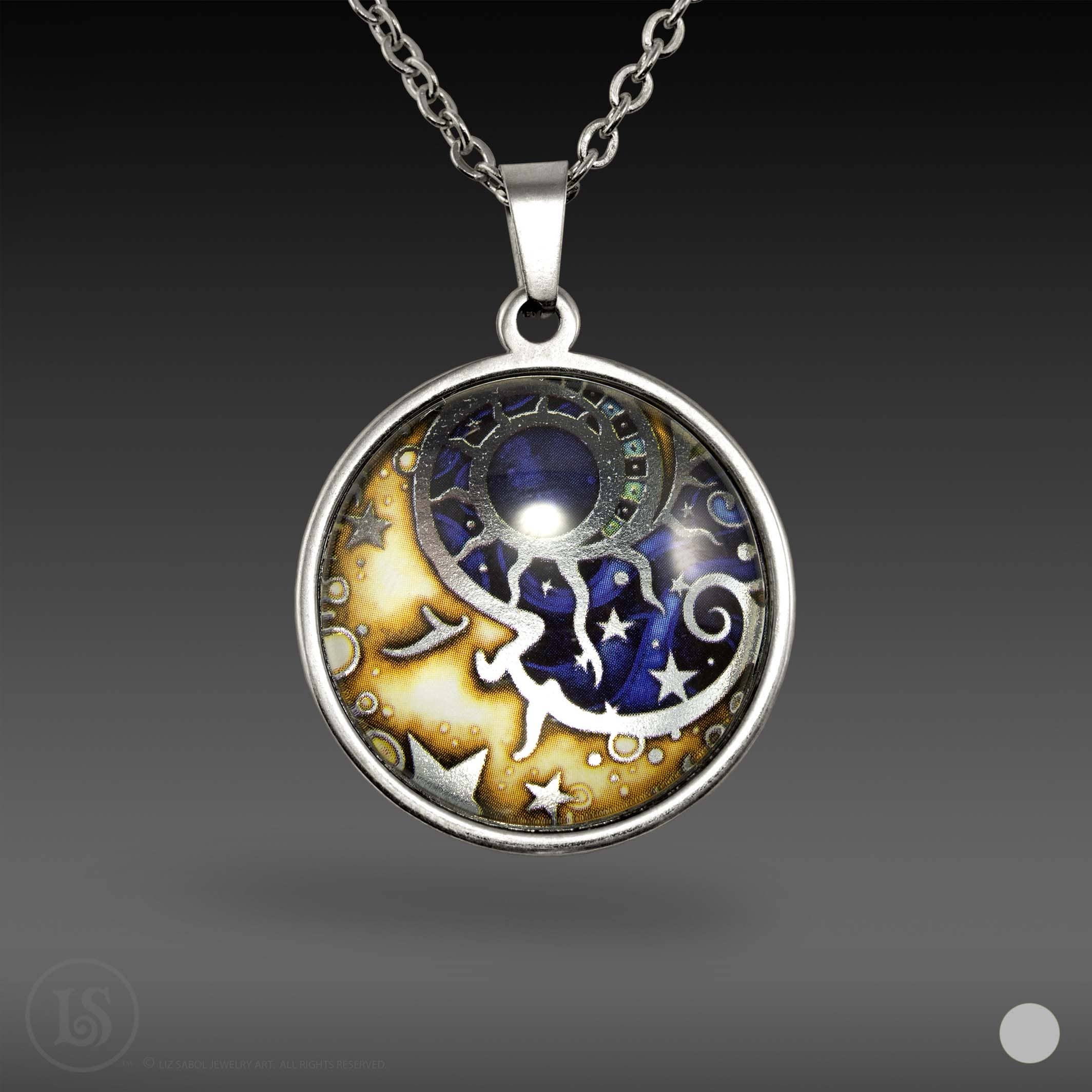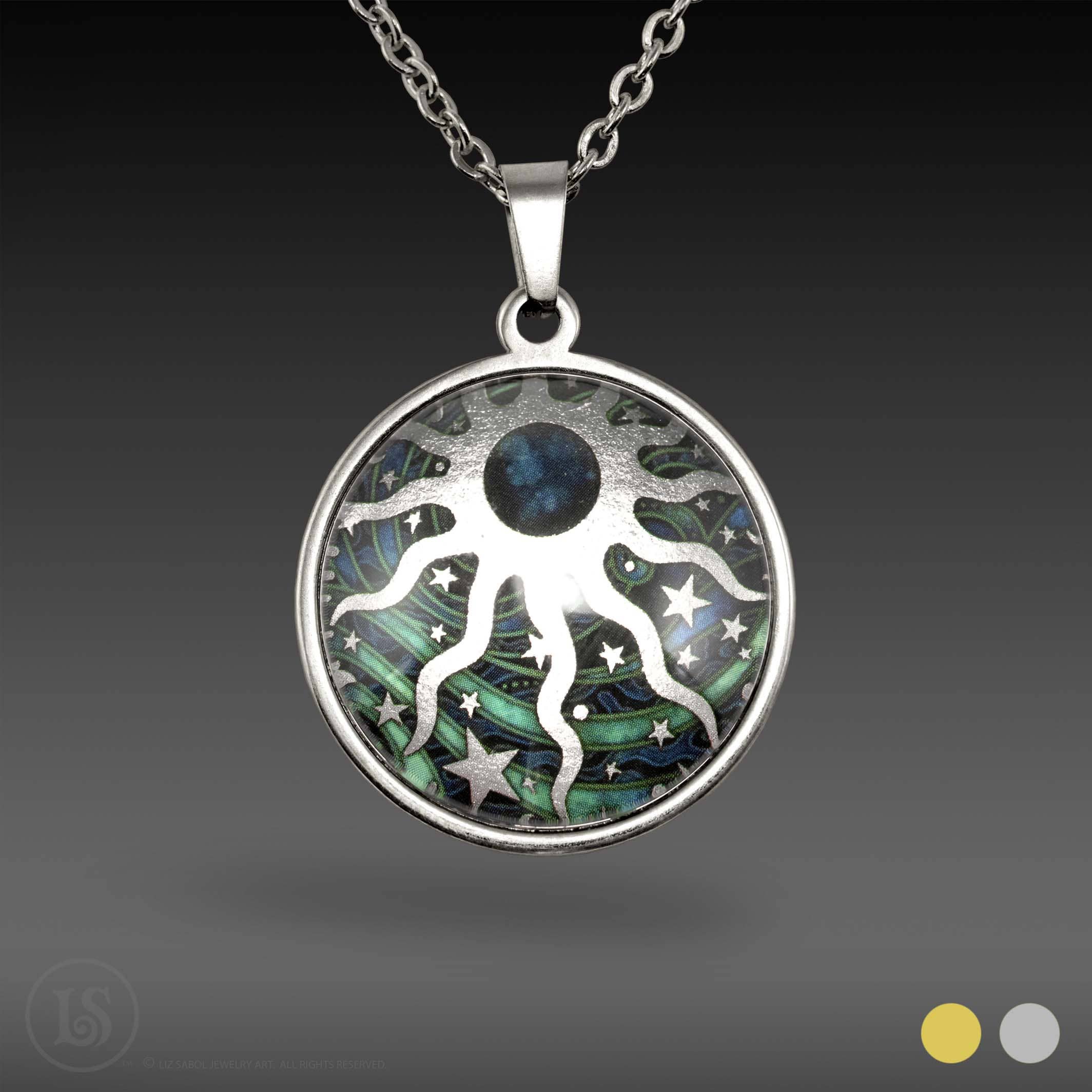 Ink and metallic foil accents on paper, mounted on stainless steel and covered in solid glass. Available in silver-tone or gold-tone. Large Round Pendant, 28mm (38mm x 28mm x 7mm) Comes on an adjustable stainless steel chain: 16" to 20" Other cord options - satin ribbon, nylon cord or velvet chokers available by request Please message me for details. Packaged in a 3"x2"x1" box with display card.