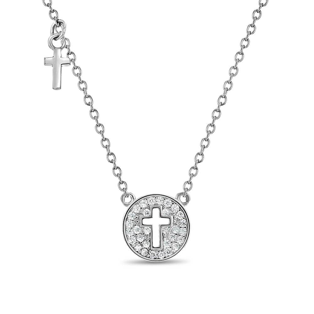 This sterling silver small cross medal necklace is the perfect addition to your little girl's jewelry collection to showcase her faith. This is a circular pendant made of clear cubic zirconia with a cross cutout in the center. The sterling silver cross cutout is attached higher up on the chain, separate from the pendant. Make this part of her baptism jewelry or everyday wear that glitters on a 16-inch around her neck. This necklace is suitable for sensitive skin and comes packaged in a Window Box, ideal for any religious occasion or a birthday. -Age Group: Elegant for Children, Young Girls & Preteens; Safe for Sensitive Skin -Material: 925 Sterling Silver -Chain Length: 16 in. (40 cm); ADJUSTABLE link chain necklace -Medal Cross Size: 0.35 in. diameter (9mm), cross medallion (clear) cubic zirconia, cut out cross -Main Stone: Clear Cubic Zirconia -Metal Stamp: 925 -Window Box Included