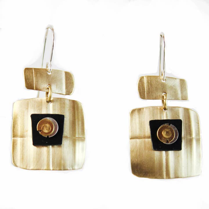 Brass, some with Copper, and Polymer Clay, Sterling,s and all made by hand in Sarasota. Gold plated brass chain 16"-18"Â has 2" extension chain. 1 3/8" x 5/8" pendant. Designed by Linda Whitney