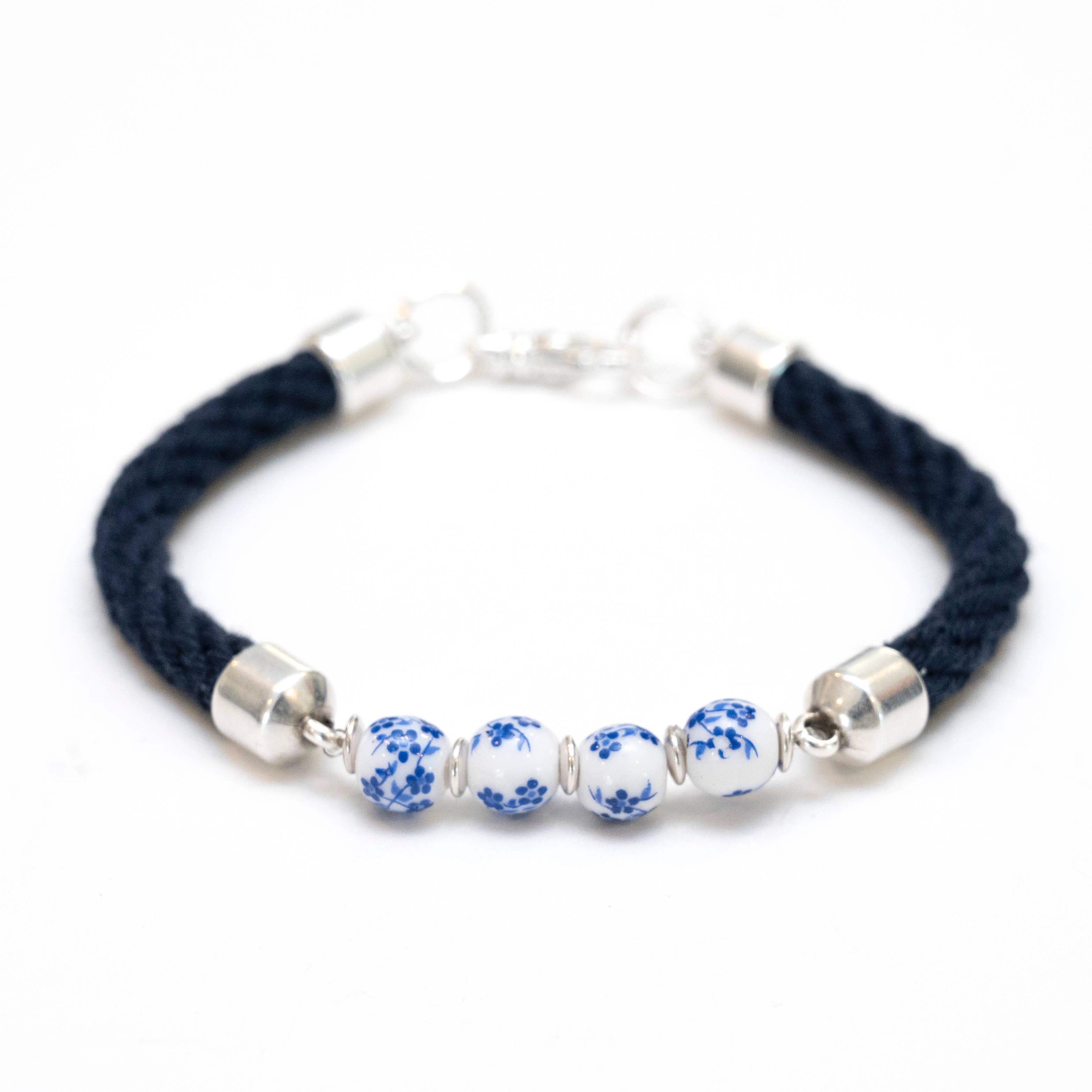 Natural cotton rope bracelet with blue and white floral ceramic beads and lobster clasp closure. The size conversions are as follows: XS = 6.5" S = 7" M = 7.5" L = 8" XL = 8.5" The most popular sizes for women are size S and M, while the most popular for men are L and XL. Category: Nautical Jewelry / Nautical Bracelet