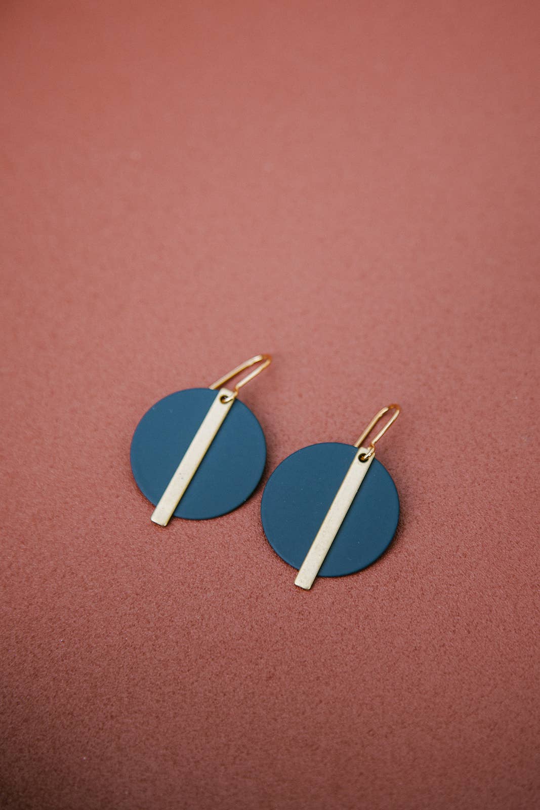 Simple yet striking - a bold, colourful disc (powder coated) and the brass hoops complement each other and create a pleasingly balanced geometric piece. All hung on gold plated earring hooks. Diameter of disc: 25mm Available in the following colours: teal, navy, khaki green, rust orange, maroon, dusty pink, mint, marine blue, mustard, peach. Matching necklace available separately and in a gift set option. The jewellery will be presented on a quality, branded jewellery backing card. Jewellery will be made in the style and colours of the images- please allow for slight differences due to the nature of handmade and the differences across devices. RRP: £24 SKU: CB006