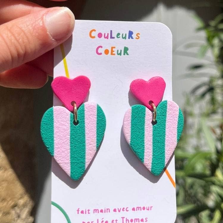 🌈 Spring Collection Rainbow Power 🌈 Pairs of earrings with pink, green, and orange stripes. Each pair is handmade and unique. Materials: Polymer clay, Stainless steel. Length: 4.5 cm. Shipping within 4-6 days.