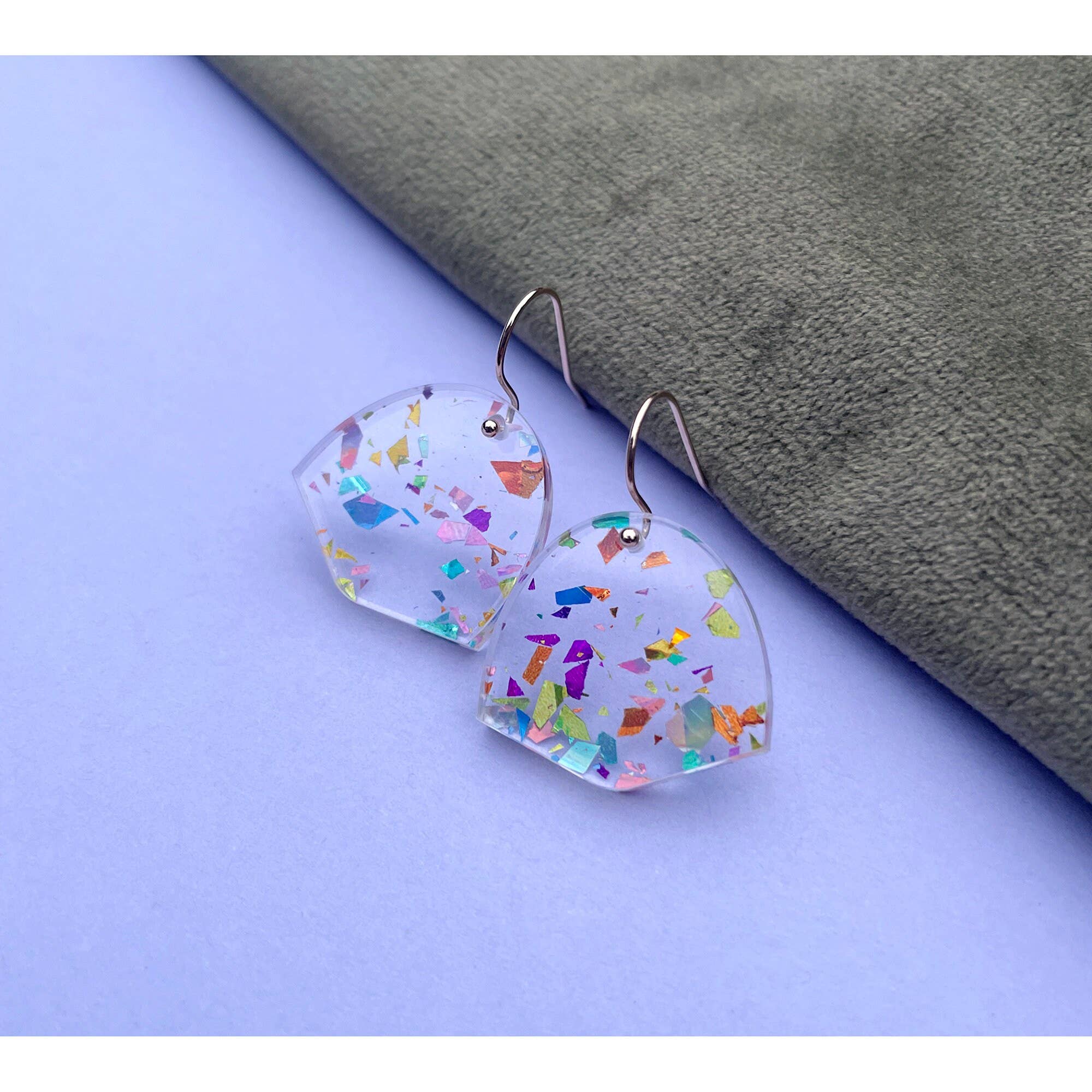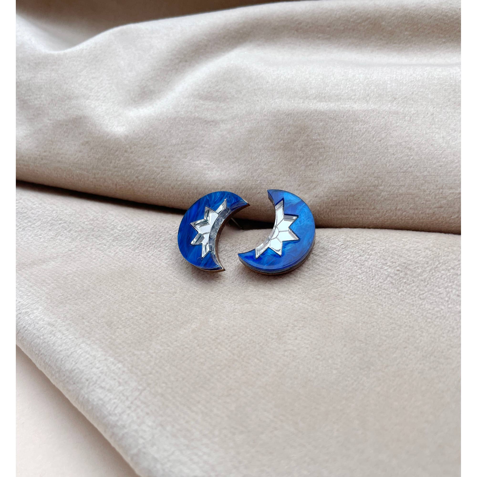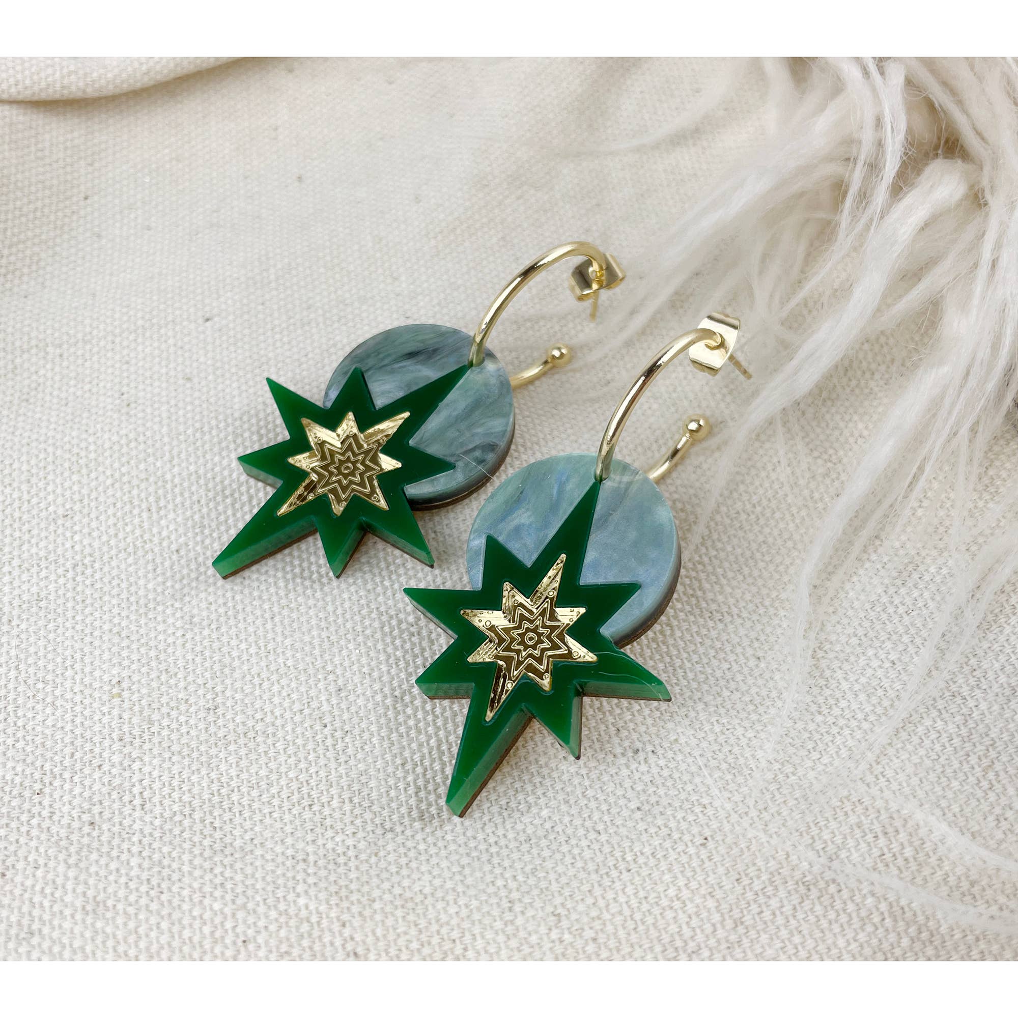 - Star Deco Hoop Earrings in Midnight Marble Colourway - The Star Deco Hoop Earrings in Midnight Marble are ideal for the festive season, yet can be worn all year round. The earrings feature intricately laser-engraved, shiny rose gold mirrored acrylic, set against a midnight blue marbled acrylic background. The design is backed onto thin plywood, making the earrings super lightweight and easy to wear. Please note, due to the nature of the hand-cast marbled acrylic, colours and pattern will vary to product photographs. - Dimensions - Hoop size: 2cm. Drop Size at widest points: Approx 3cm x 3.8cm These earrings are sent displayed on a custom-made arch shaped earring card, ideal for gifting. Earrings can also be sent in custom foil-stamped gift boxes for an additional fee.