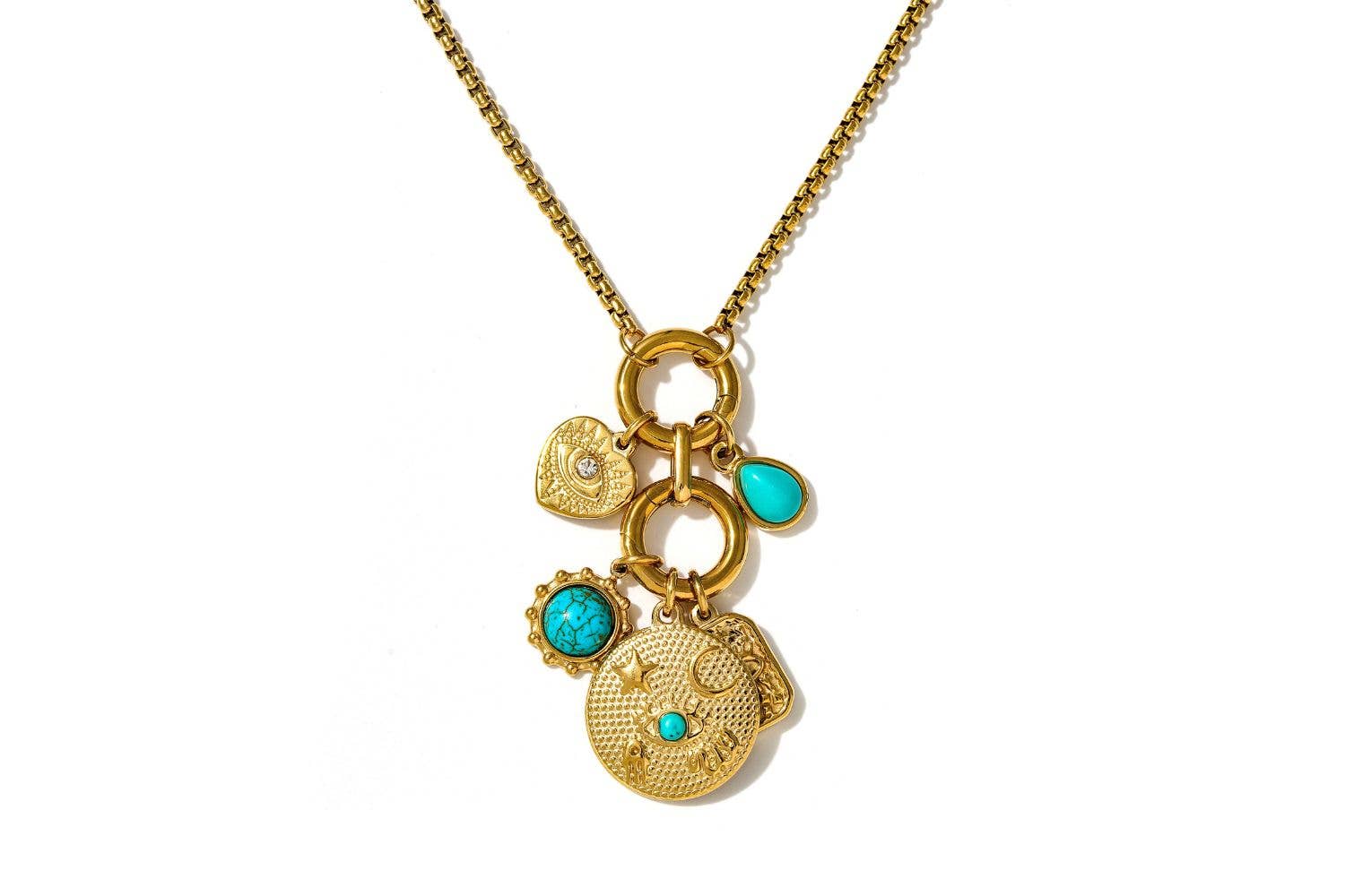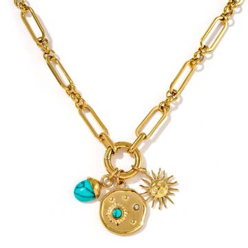 Crafted in waterproof stainless steel and finished with a luxe 14k gold PVD coating, Luma features a bold paperclip chain and a trio of detachable charms: a radiant sun face, a hammered coin with turquoise howlite and crystal accents, and a dome-topped turquoise howlite drop. Together they symbolise light, clarity, and protection, perfect for those who follow their own path. Whether you wear it layered with minimalist chains, teamed with a bikini and oversized shirt, or styled solo with a deep neckline, Luma brings warmth, movement, and joyful intention to your jewellery story. You can even remove the charms and wear the chunky chain on its own for a completely fresh vibe. One necklace, endless moods.