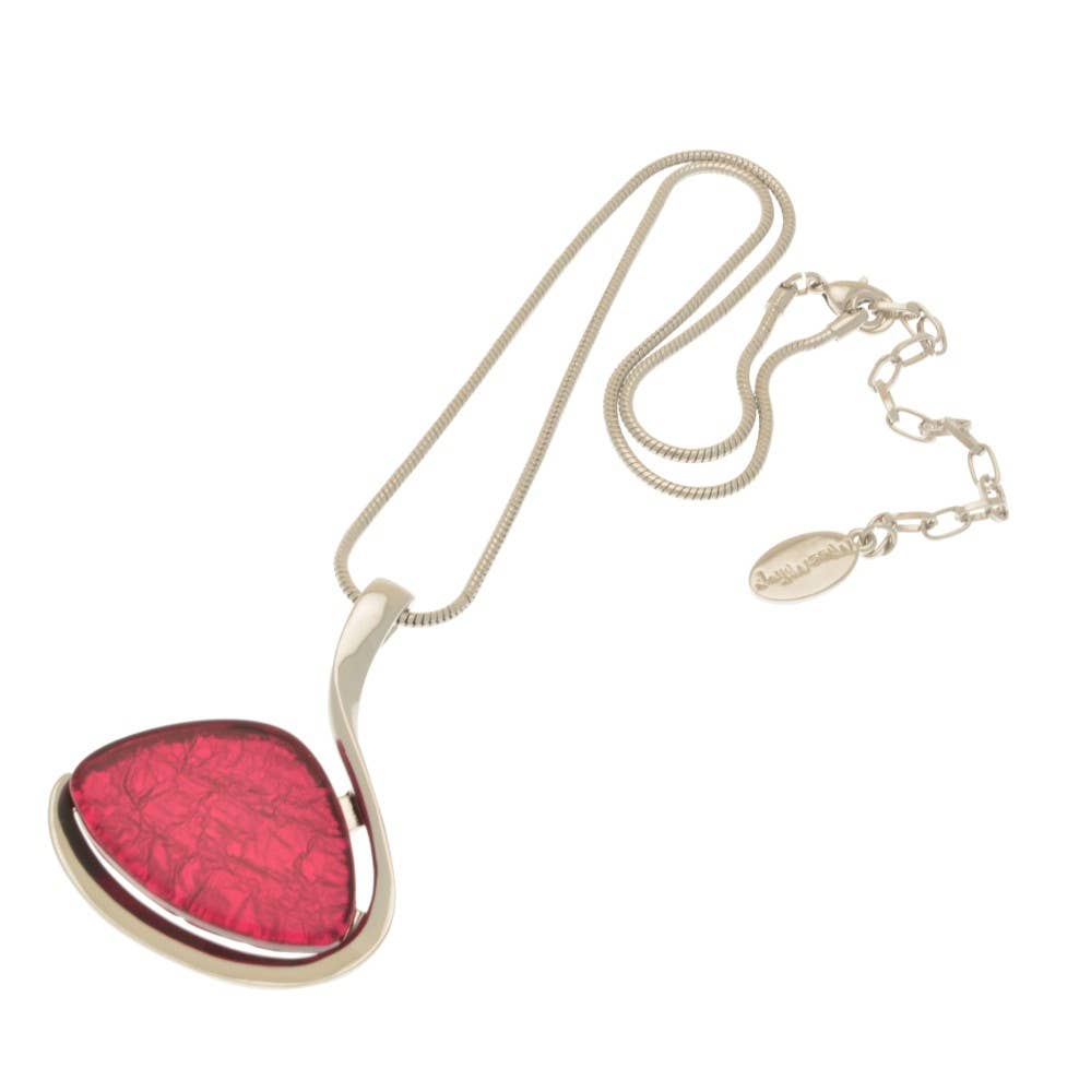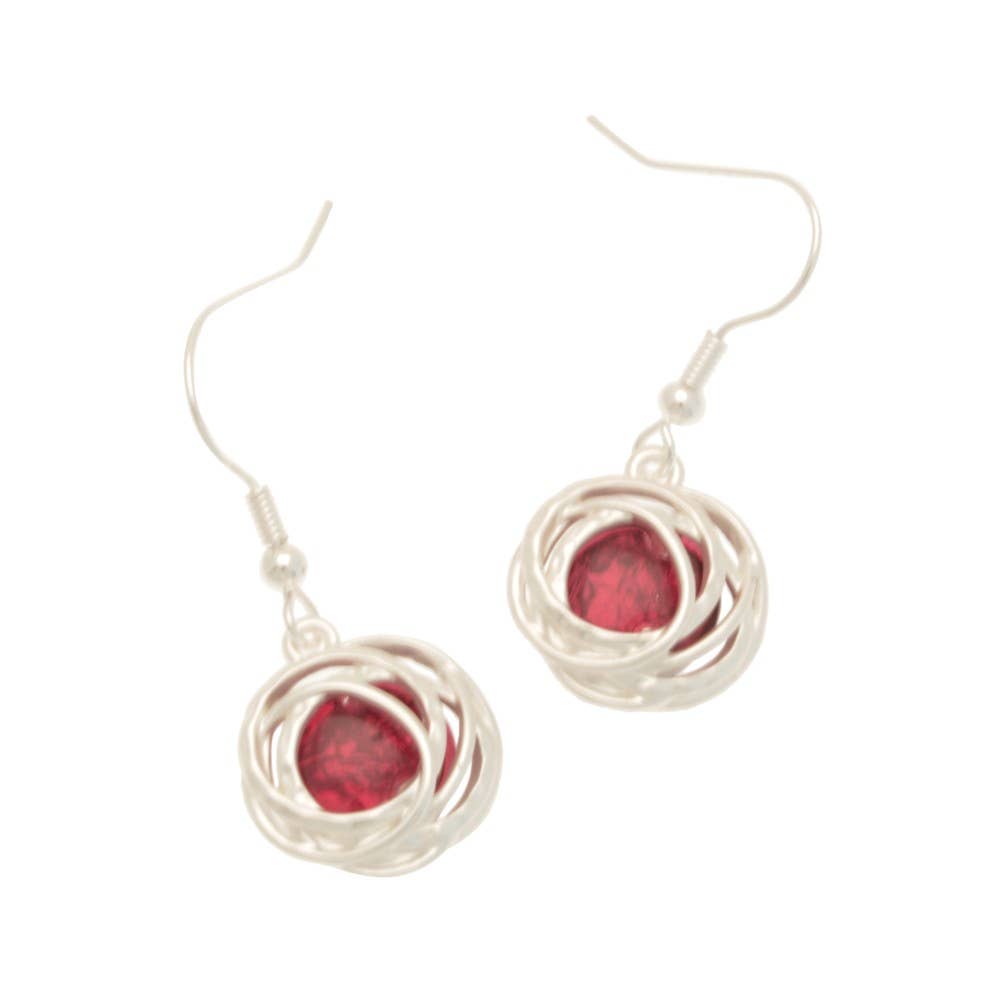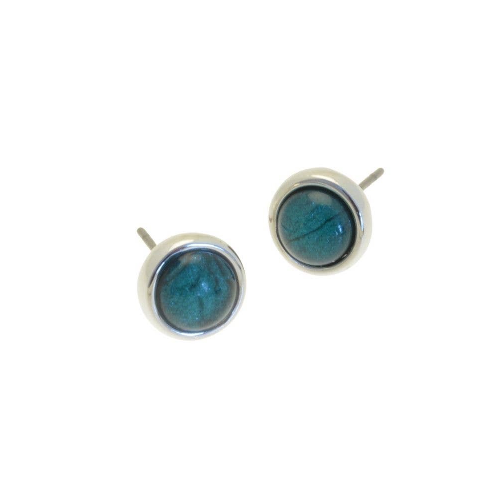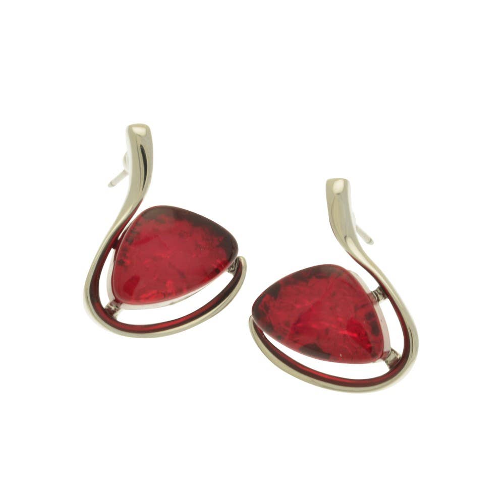 These drop earrings use a stylish silver-coloured open ellipse to encase a pretty aubergine diamond made with foil-backed resin for depth. The earrings hang 2.5cm down and are 1.5cm across. They are held in place with a post and silicon butterfly.