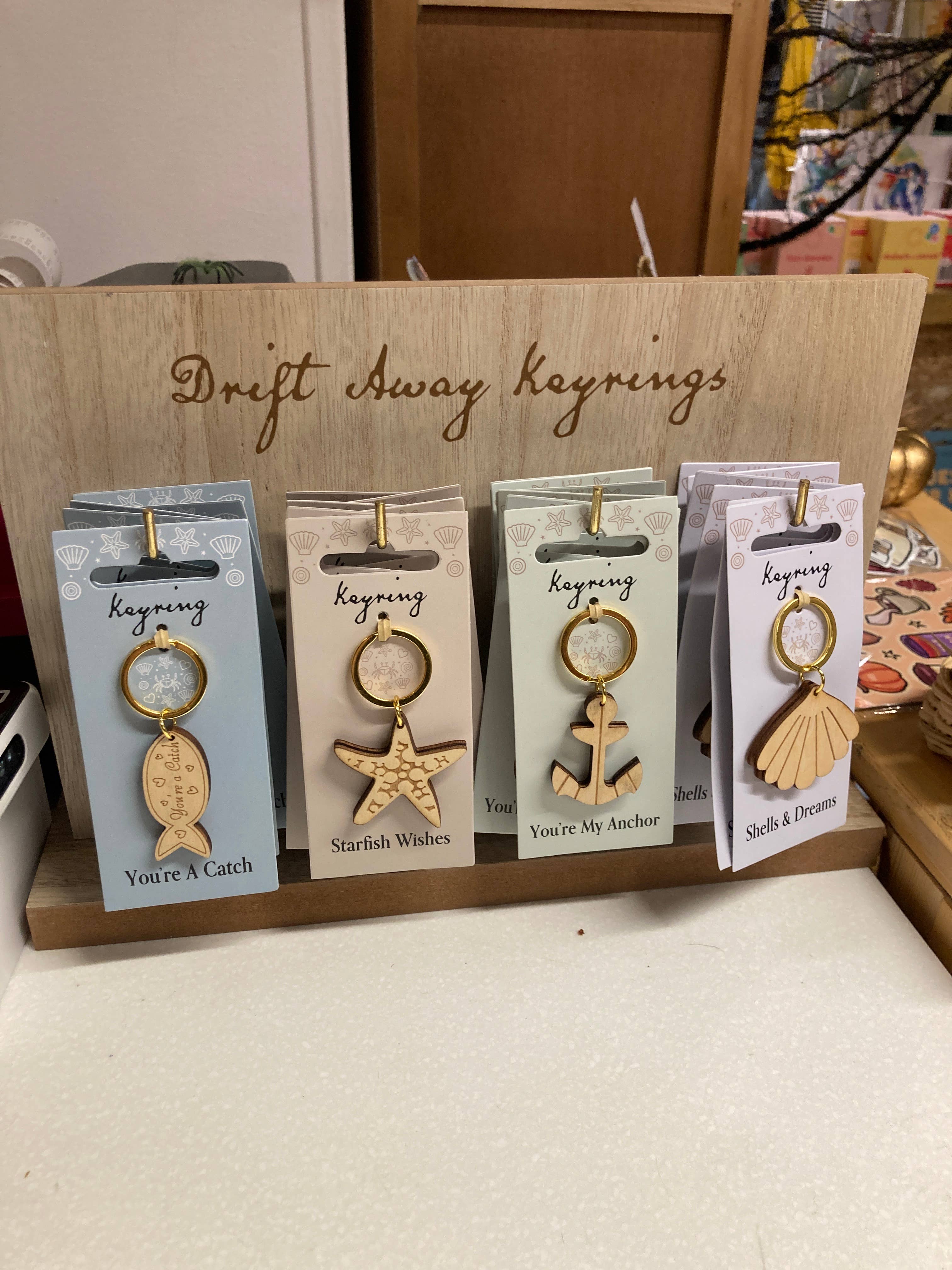 Set sail into summer with this set of 24 nautical wooden keyrings, presented on a matching countertop display. Featuring charming designs of a fish, starfish, shell, and anchor, these keyrings serve as a reminder of coastal life. Each keyring comes with a matching backing card with one of the following phrases: "You're a Catch", "Starfish Wishes", "Shells & Dreams", and "You're My Anchor". Perfect as a gift or souvenir for a beach lover. Thet set includes 4 assorted designs with 6 of each design. Designed by Something Different Wholesale and part of the Drift Away collection of seaside gifts and home decor.