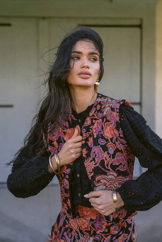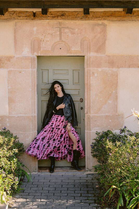 Long black skirt with floral print in red and pink tones. Fitted waist and fluid drape for a colorful and feminine boho style.