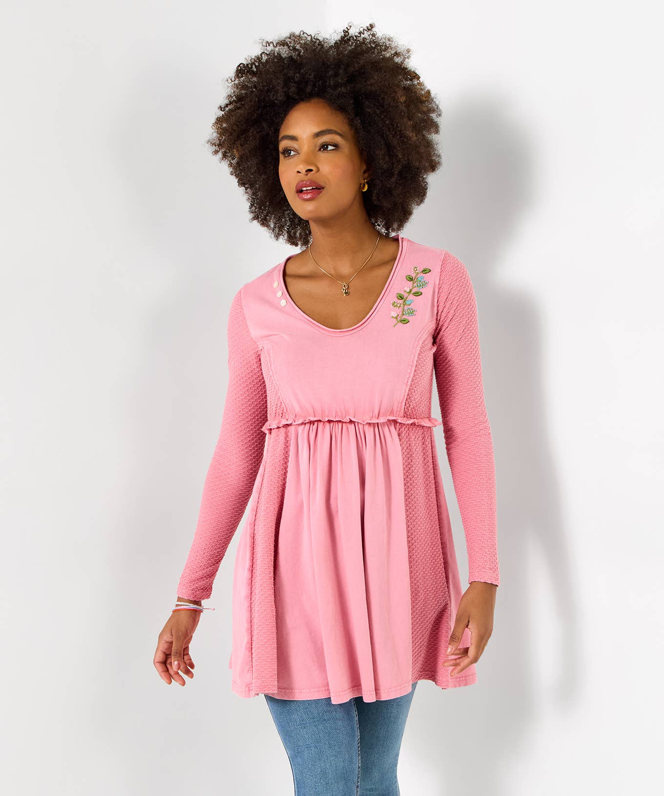 Introducing our Emb. Drawstring Tunic from Leopards & Roses, a perfect addition to your fall/winter wardrobe. This women's knit top is made from 100% cotton, ensuring a comfortable and warm fit. The unique drawstring detail adds a touch of individuality to this piece, making it a stand-out in any ensemble. For the best care, we recommend a gentle hand wash. By purchasing our clothing, you're not only acquiring a beautiful garment but also supporting our factory workers and contributing to the fight against poverty within their communities.