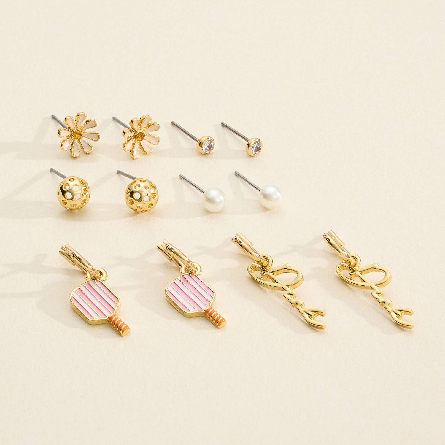 12-Piece Gold Earring Set – Key, Lock, Bow, & Clover Charm Collection (18K Gold Dipped) Unlock timeless elegance with this 12-Piece Gold Earring Set, featuring 6 beautifully crafted designs that exude sophistication and charm. This collection includes dainty pearl studs, gold pyramid accents, clover motifs, sparkling bows, and chic charm hoops with key and lock designs. Each piece is dipped in 18K gold, offering a luxurious finish that’s perfect for layering, mixing, and matching. Versatile and stylish, this set is perfect for gifting or adding a touch of glamour to your jewelry