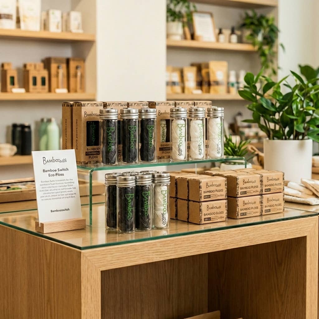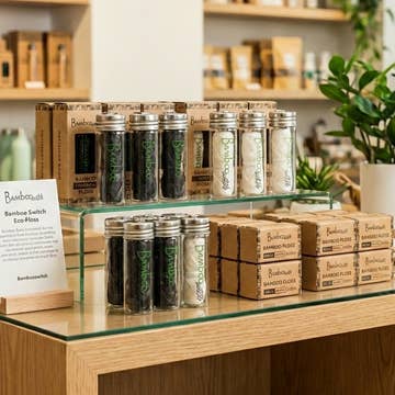 Upgrade your oral care with this bamboo floss, designed to effectively remove plaque and debris while naturally freshening your smile. Made from biodegradable bamboo fiber this eco-friendly floss is plastic-free. ~~~~ How to Use: Gently glide the floss between teeth and along the gum line to remove buildup and maintain oral hygiene. ~~~~ Care Instructions: Store in a cool, dry place. Dispose of used floss in a compost bin or appropriate waste receptacle. ~~~~ What's Included: One Spool of Floss in Glass Container ~~~~ Ingredients: Bamboo Tea Tree Oil for Mint Infusion Candellila ~~~~ Floss Spool Dimensions: 90 feet / 30 meters Box Dimensions: Length: 1 inch Width: 1 inch Height: 3.25 inches ~~~~ Packaging: Recycled paper box with no tape or glue, held together with foldable tabs ~~~~ Branded: Yes ~~~~ Able to White Label: No