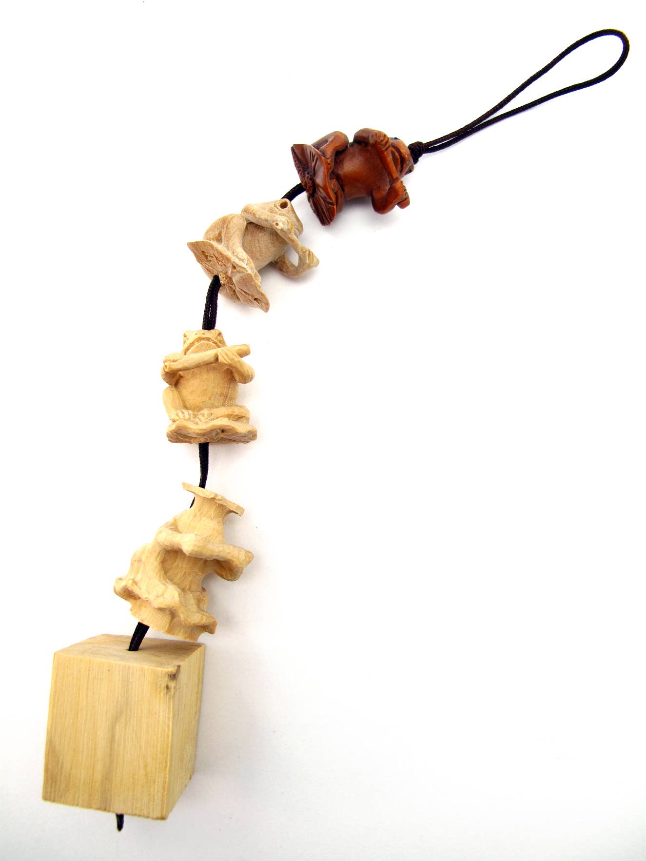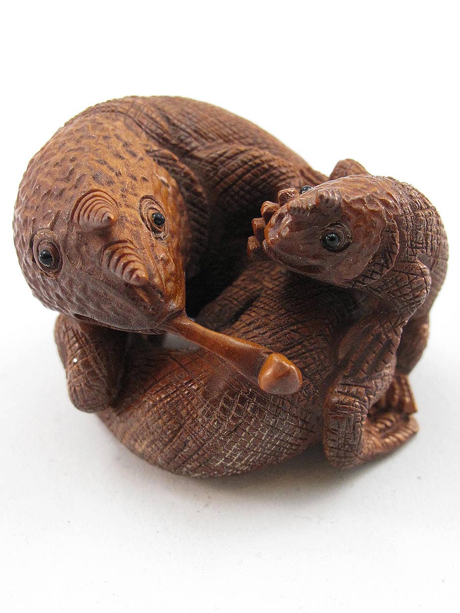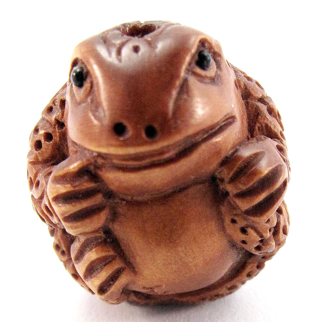 Handcarved netsuke of turtle hiding in it's shell with hole drilled through underside. In traditional Japanese dress, the inro box hung from the obi (belt) of a kimono, on a double cord. At the top of the cord, a large carving called a netsuke (pronounced nets-kay) acted as a toggle to anchor the inro. Most of our netsuke have authentic double-holes in the base, so when strung on a necklace they will hang upsidedown.