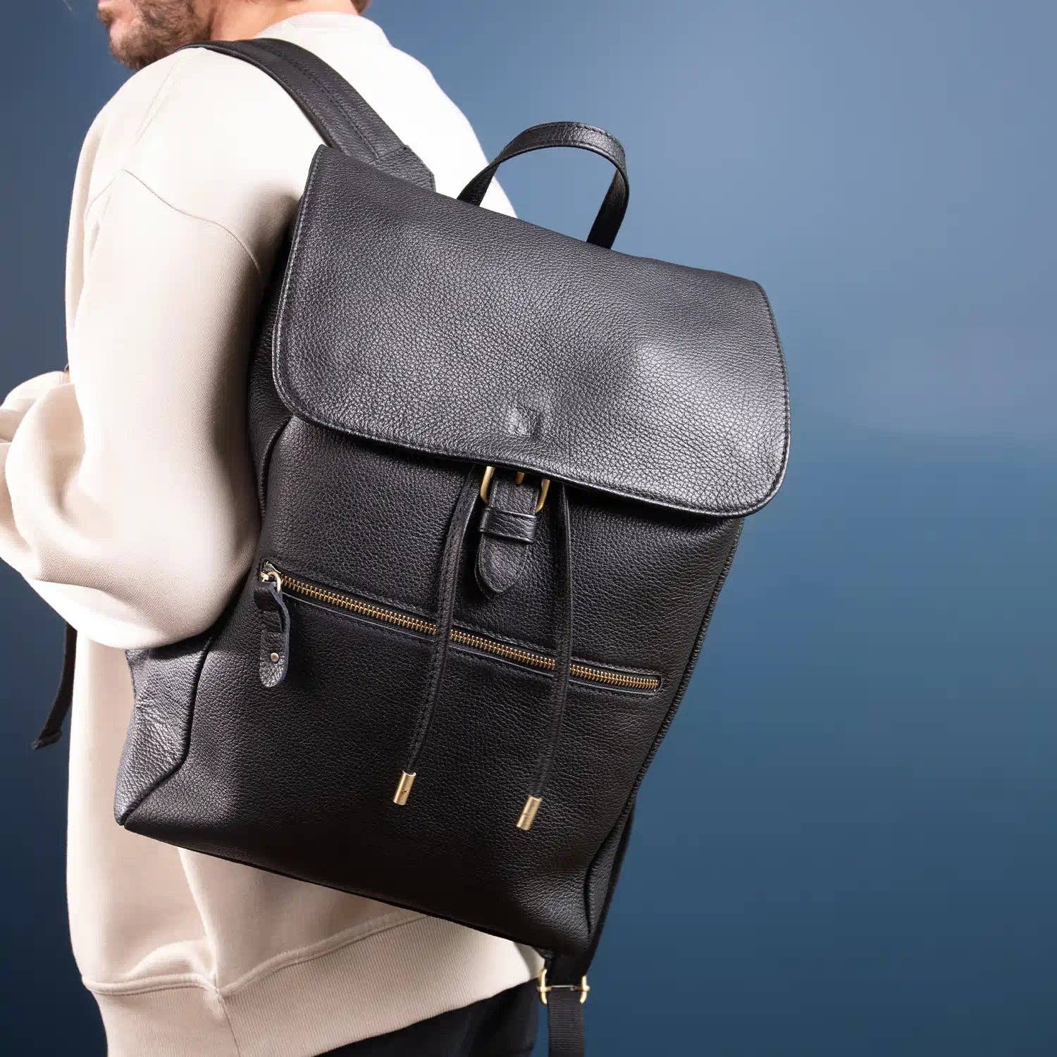 A minimalist, vintage road-ready large leather backpack that forgoes the standard zipper for a roll top. Handmade with the finest full-grain buffalo leather it is both supple and durable. It features a roll-top design with a roomy lined interior, external pocket & an inner zipped pocket to provide ample storage space. The large roomy lined compartment provides plenty of space to carry all your merchandise, travel, and work essentials including a 14" laptop. It is versatile in nature fill it up, roll it down as per your need. Materials Vegetable-tanned full-grain leather YKK Zippers Antique Brass fittings Features Adjustable Padded Shoulder Strap Inner zip pocket One external front pockets Large lined compartment Airline carry-on friendly