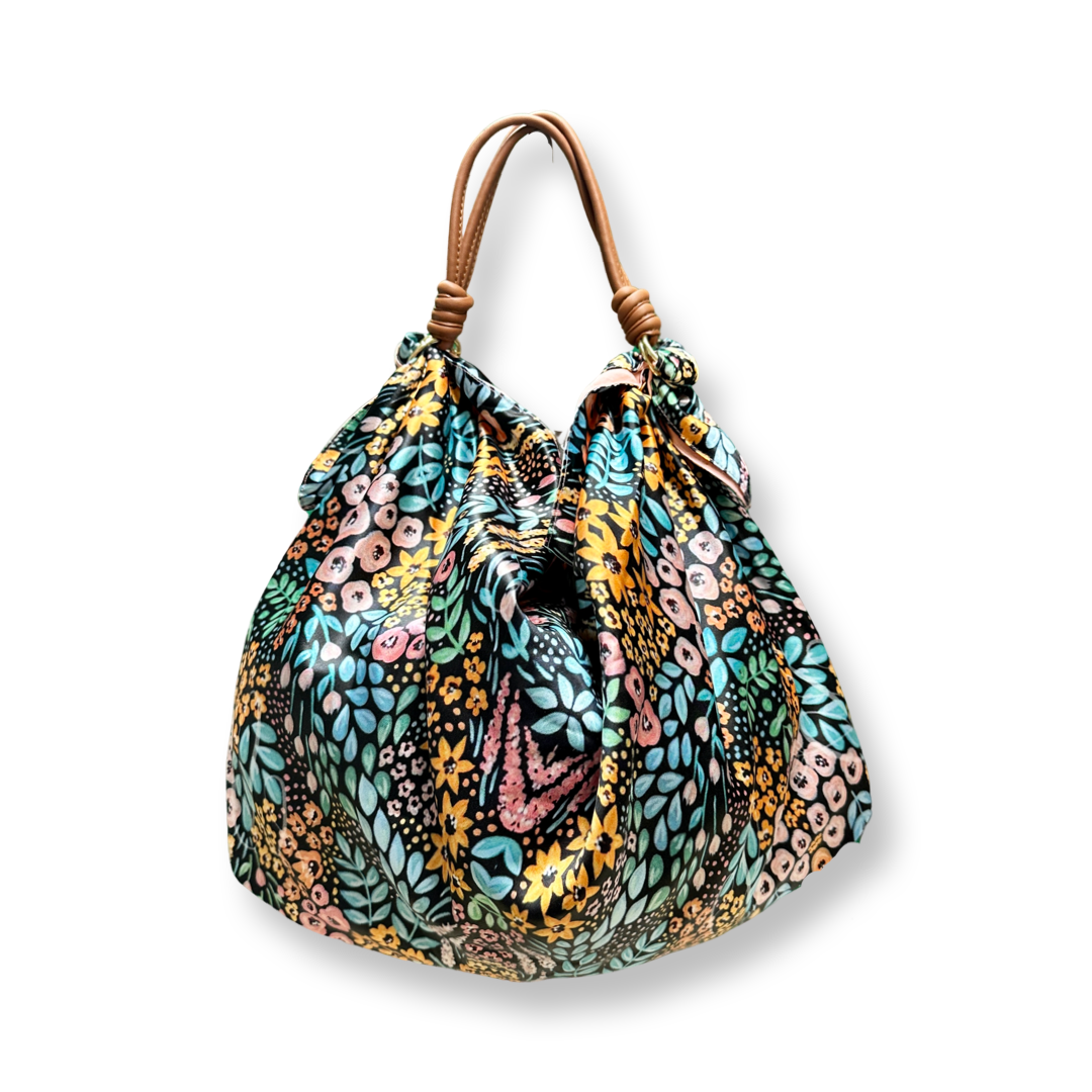 Scarf Bag with Vegan Strap Dimension: (38"L x 17"H) Composition: Poly Satin with a synthetic leather strap Techniques: Lustrous soft material crafted using a weaving technique Pattern: Scarf Bag made with shades of pink yellow green orange Wash Care: Hand Wash