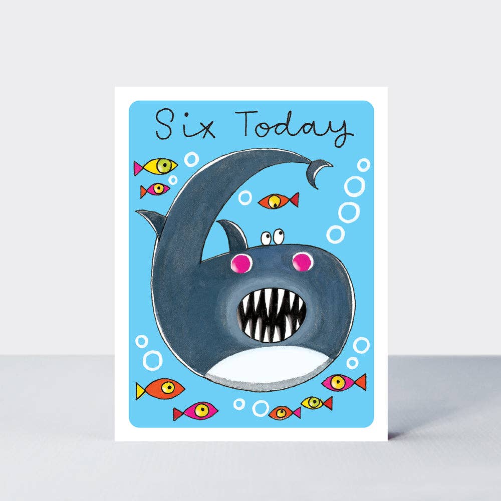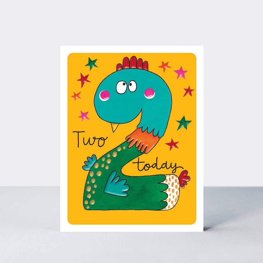 A children's age 5 card in a new small format. The card features a funny dinosaur character in the shape of a number 5. Printed on textured board with vibrant inks, the cards are finished with spot UV highlights and packaged with soft neutral coloured envelopes. Size: 130mm x 100mm Finish: Spot UV