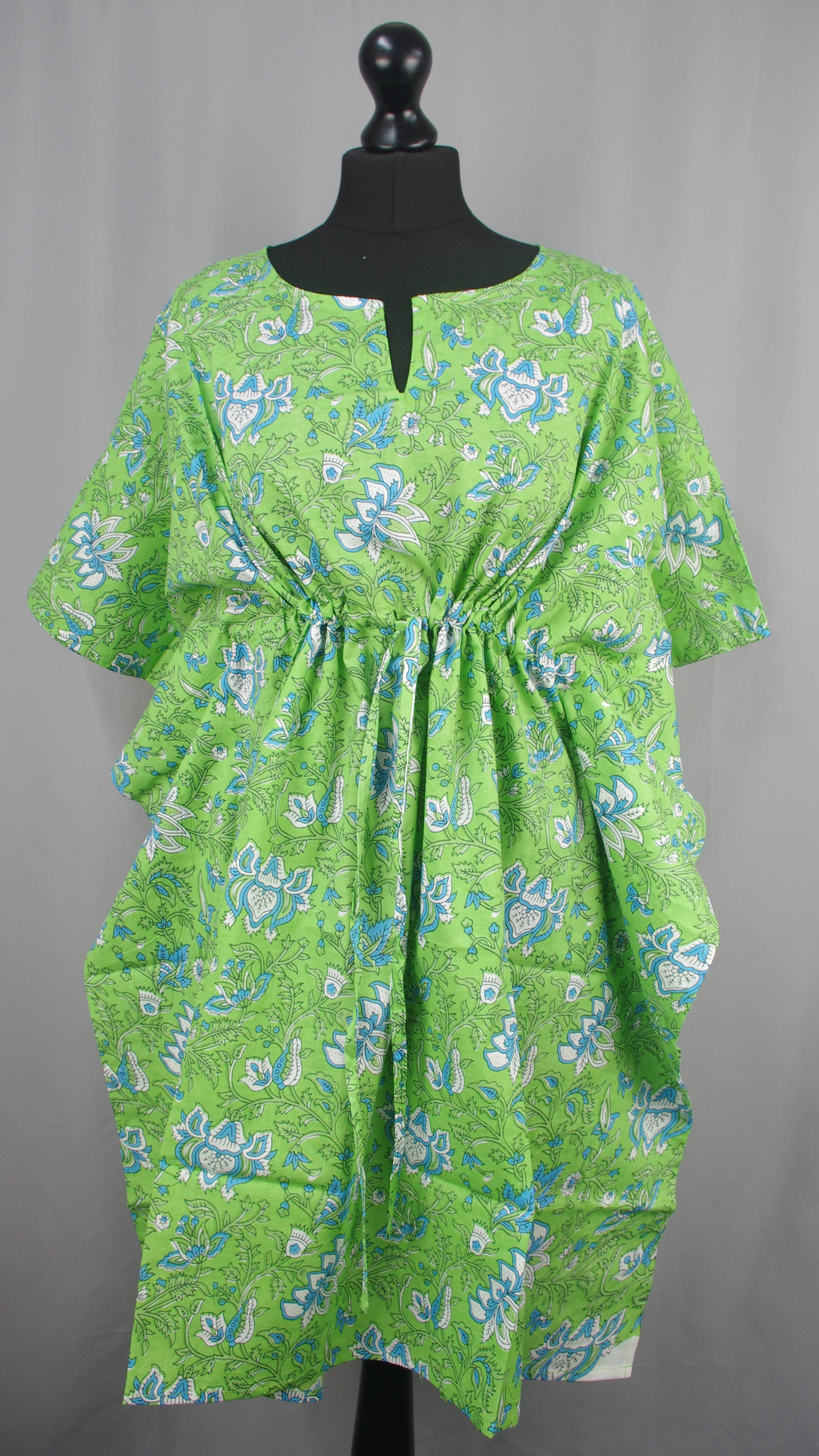 Our short stunning block printed kaftan has drawstring detail to adjust the fit, and side slits for an easy-breezy look. Fabric- 100% Cotton Cambric fabric Size- Free Size Length: 90 -91 cm / 35-36'' approx. (Short Kaftan ) Product colour may look slightly different from the picture due to the limitations of the camera and individual monitor settings.