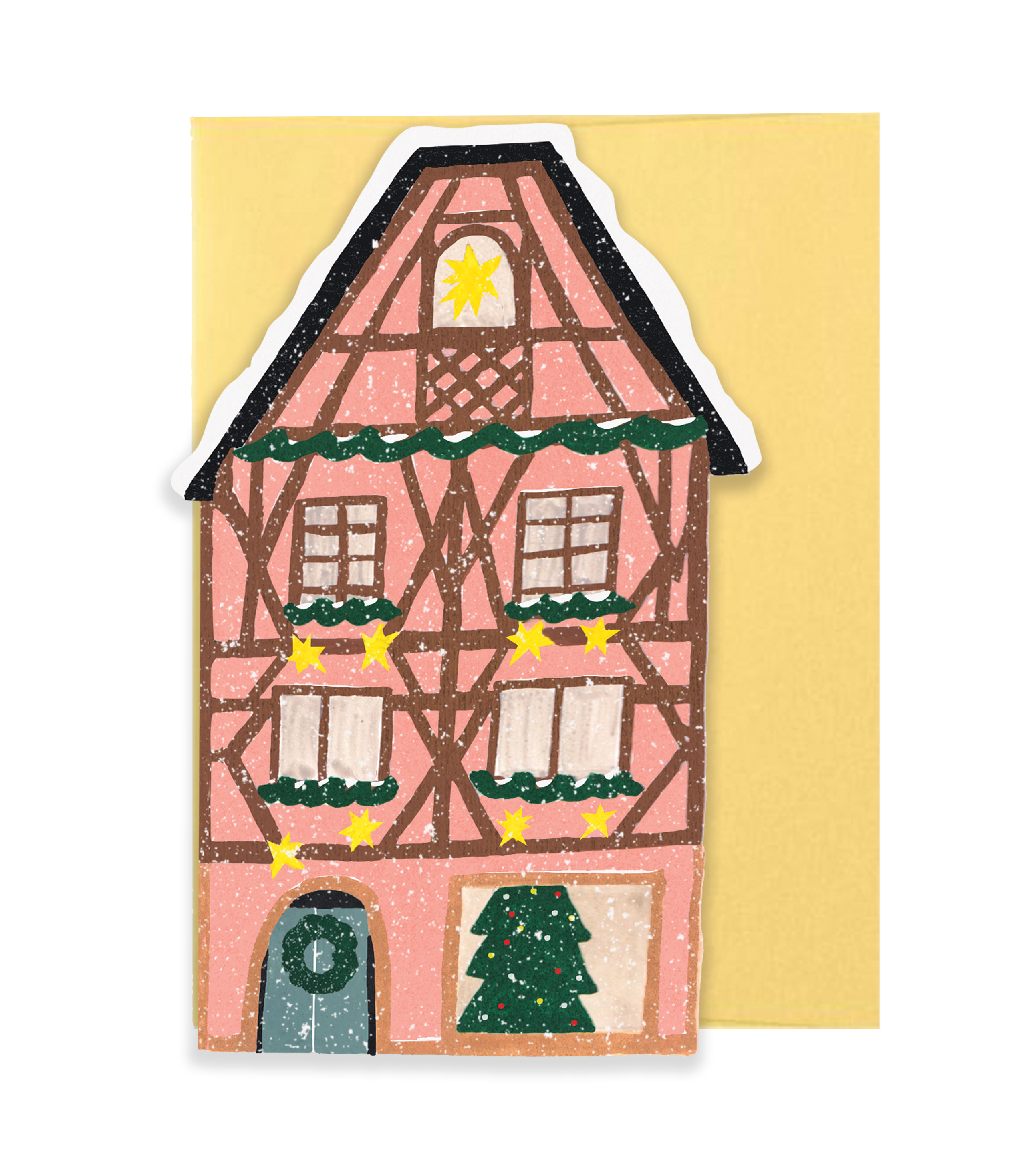 A snowy triangular blue cottage, calm and twinkling with holiday magic. Part of our Winter Cottage Collection, inspired by nostalgic village scenes and Nordic charm. A6 - 6.25"x4.5" die cut folded card, printed in the USA on sustainably produced 18pt coated card stock. Each folded card is blank inside, comes with a shiny golden envelope and is wrapped in a sustainable cello bag. Shop the rest of the Winter Cottage Collection here Original illustrations by Isabelle. Made by French hands in the USA!