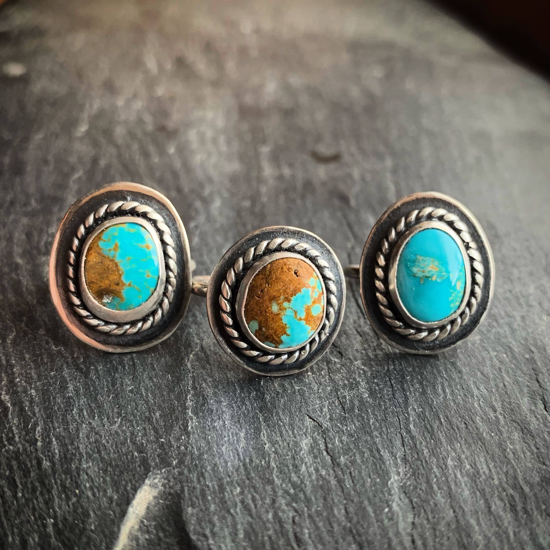 This sterling silver ring features a piece of American Turquoise, known for its color ranges of blues, greens, browns and blacks. Each silver design element of each ring is made by hand and soldered together. The Turquoise in each ring will vary in color, pattern, shape and sometimes slightly in size. Material: Sterling silver, American Turquoise. Size: Each ring measures approximately 1" in length, but may vary depending on stone shape.