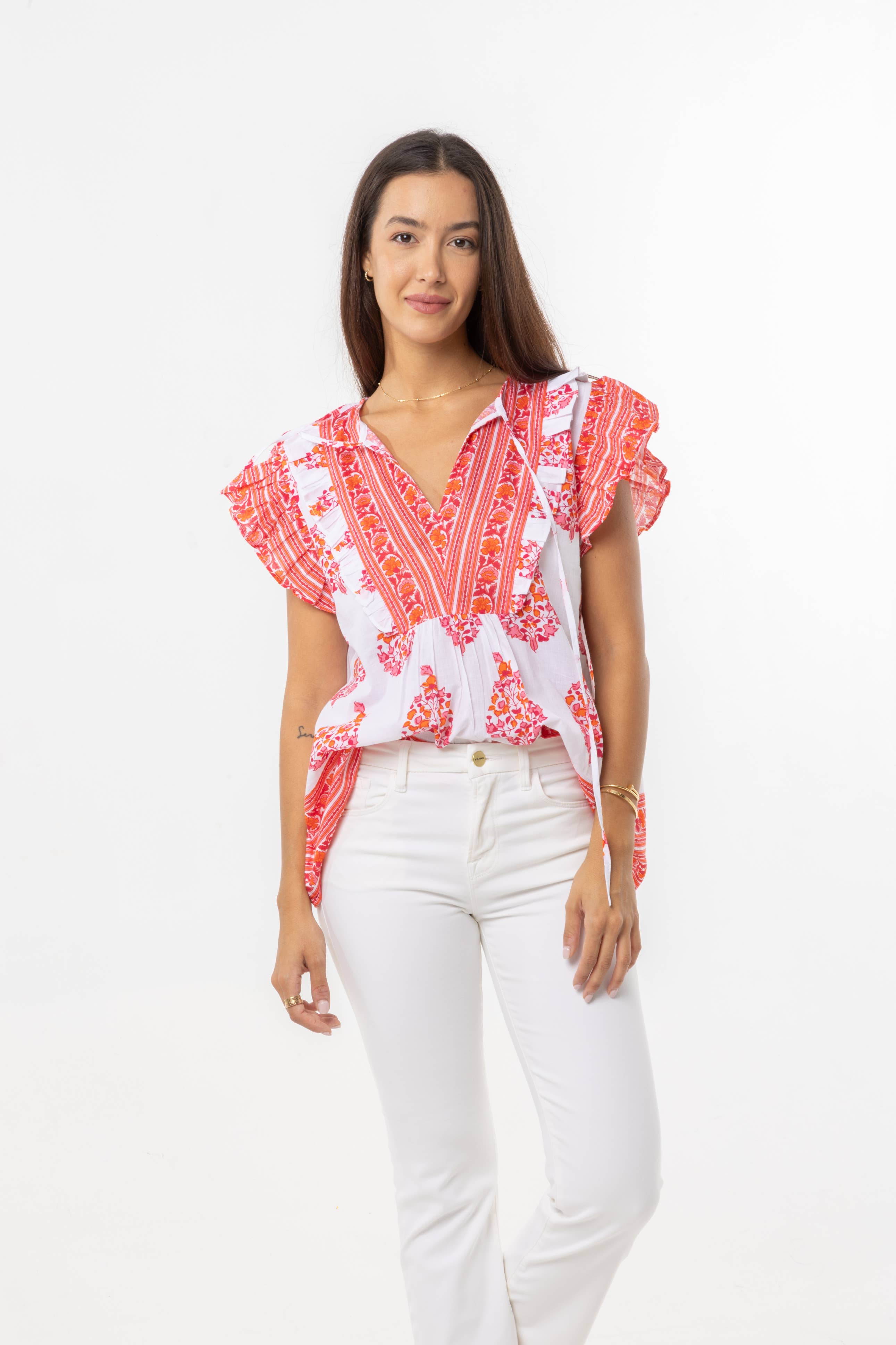 The Bea printed top inn flower , playful ruffles around neckline and slightly balloon sleeves. A lightweight Floral Block-print for an ultimate look.