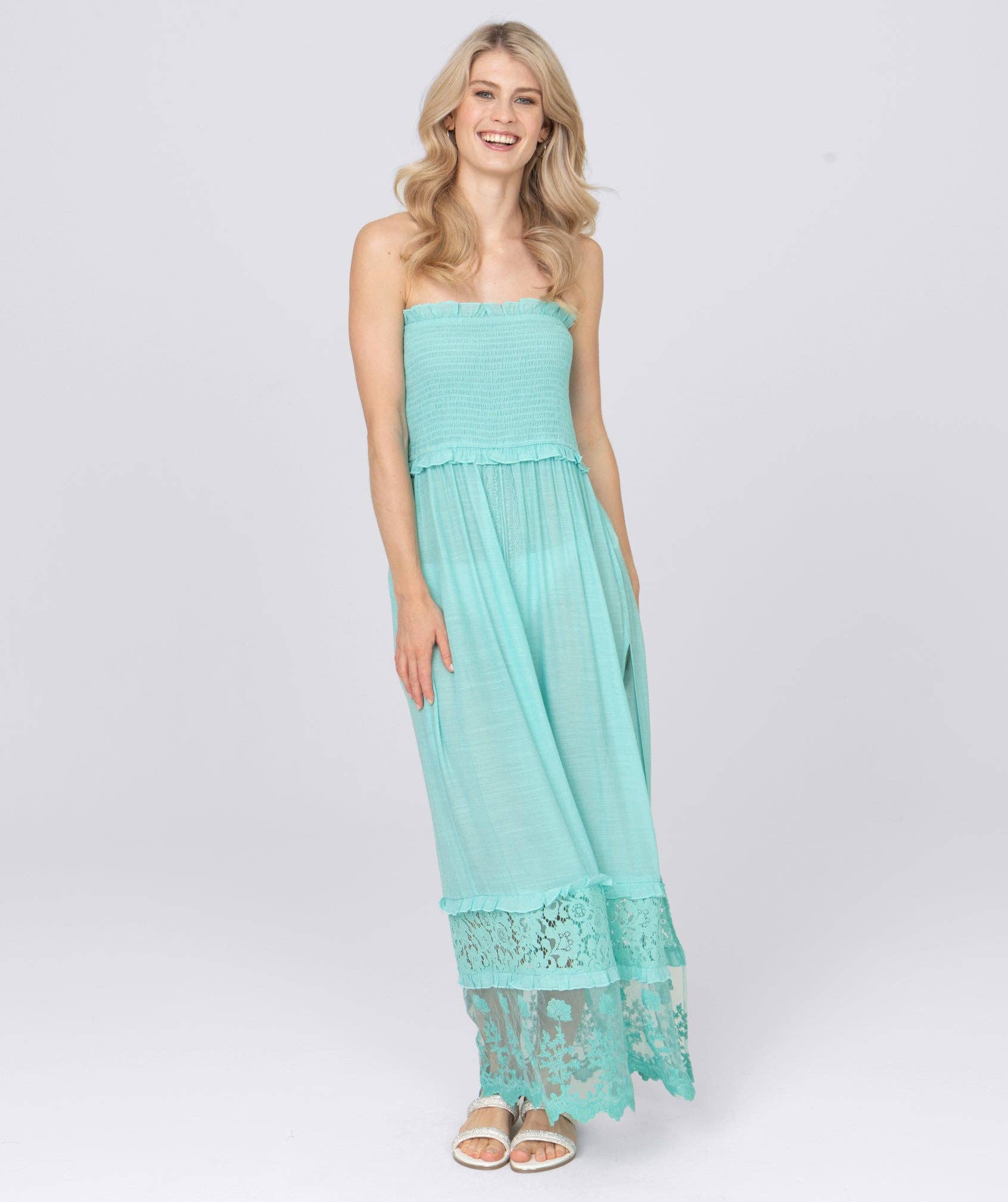 The Turquoise Sequin Lace Beach Kimono is a stunning full-length lacy creation. This truly is a beach kimono that belongs by the sea or by the pool. Not only is it a study in sheer elegance, but it also features sequin embellishments that will add sparkle and glam to your holiday waterside-ready look. This long-sleeved lace coverup keeps things cool and is fully open at the front with no closure.
