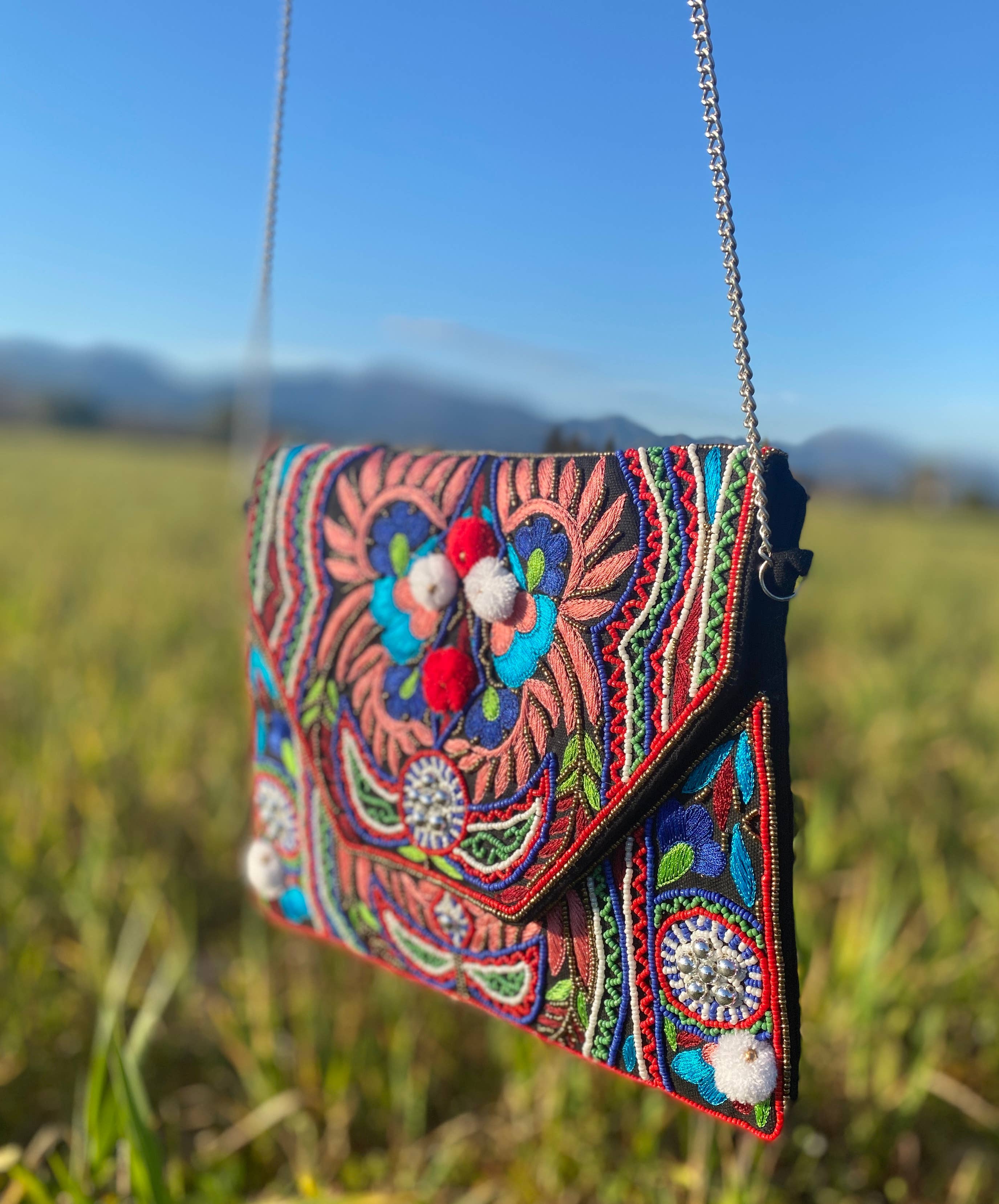 Beautiful boho style bag hand embroidered by artisans from India, decorated with beads and coins. With print on the front and back. It's a perfect size to wear both day and night. It has a click closure and an internal pocket that closes with a zipper. It can be carried as a handbag or hung with a rope. MEASURES 29X21 CM PROMOTION 10% DISCOUNT (29.19€) 26.27€