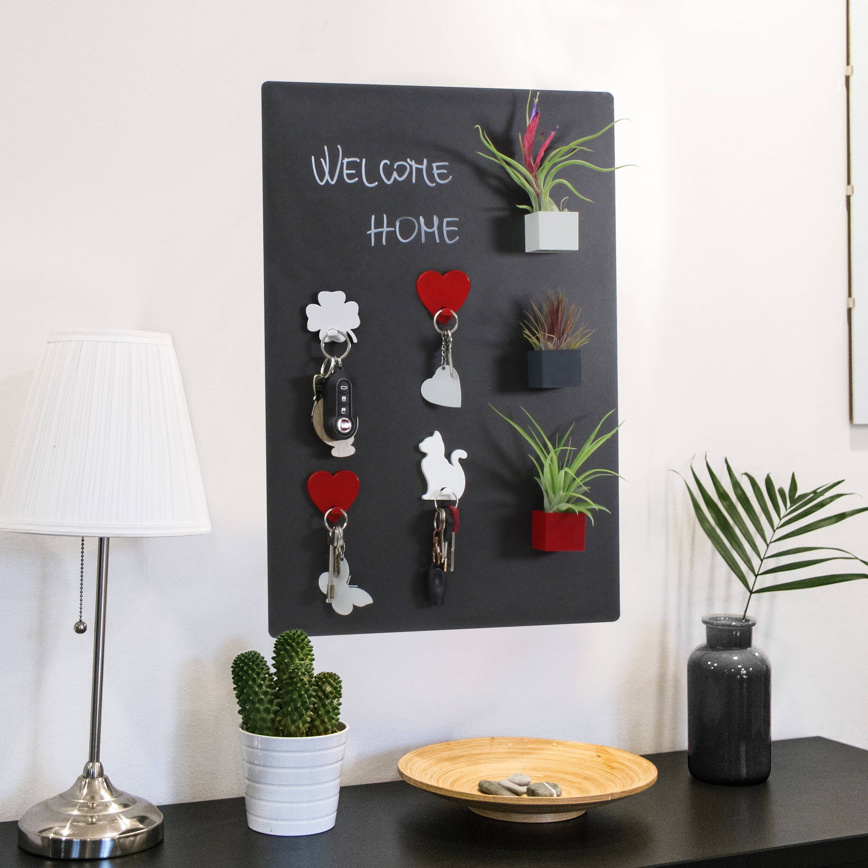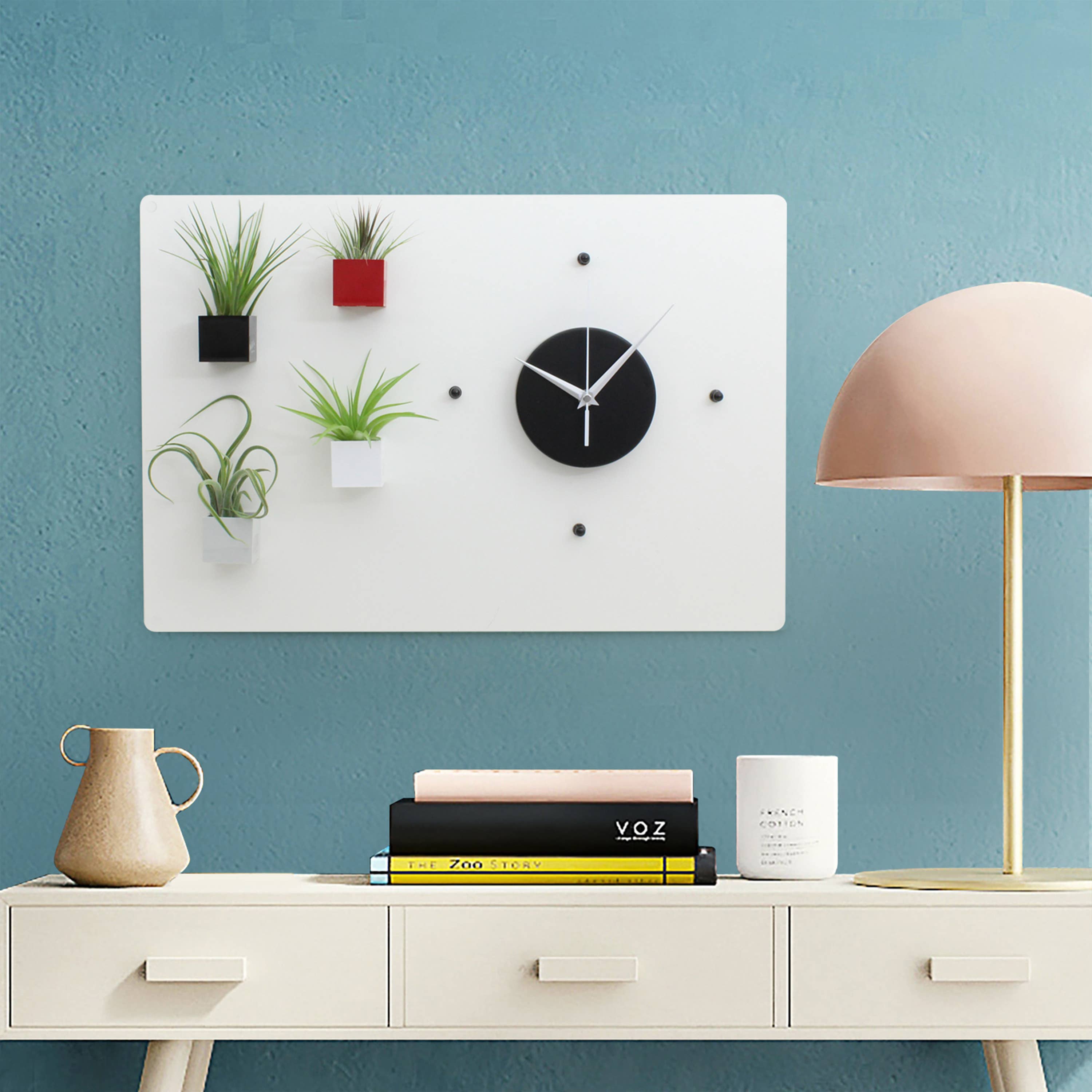 Magnetic wall clock - square shape, matt white color. Silent and smooth sweeping seconds hand. Its minimal and essential design is perfect for any style of interior, at home or in the office. Dimensions (maximum size with hands): 22 cm x h 3.5 cm. Works with a 1.5-volt AA battery (not supplied). KalaMitica magnetic clock: its simple and essential shapes will allow you to make up your clock as you like! The possibilities are nearly endless: write the numbers on the blackboard with liquid chalk markers or mark the hours with Air Plants, magnetic pins, hangers...the only limit is your imagination! Have fun changing your time: detach, move and reattach your favourite accessories to create new combinations. Choose the accessories to match and create a functional and design composition for your kitchen, bedroom, living room, hall or office. Thanks to the two powerful magnets on the back, the clock can be attached to all KalaMitica chalkboards and to any metal surface.