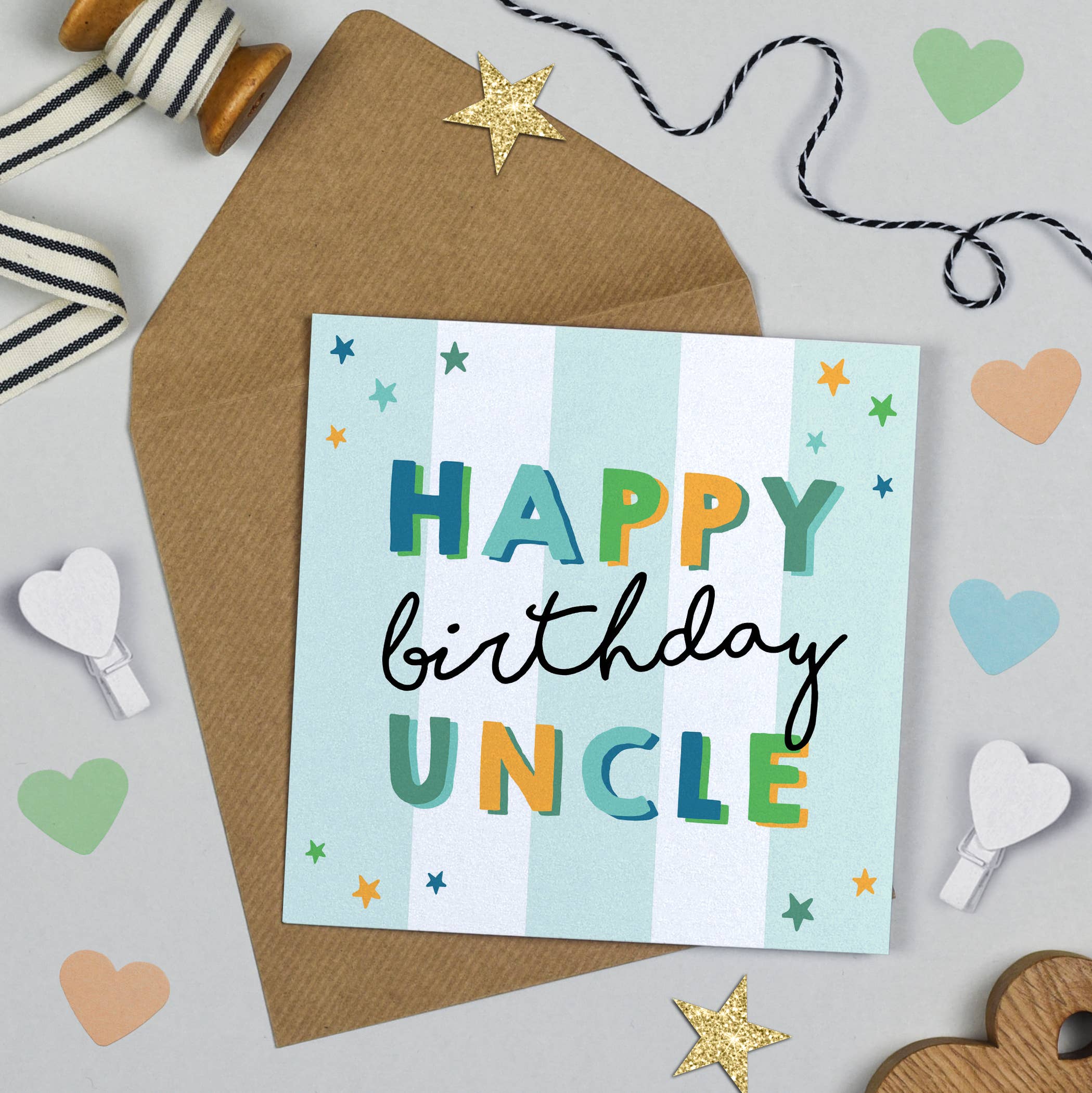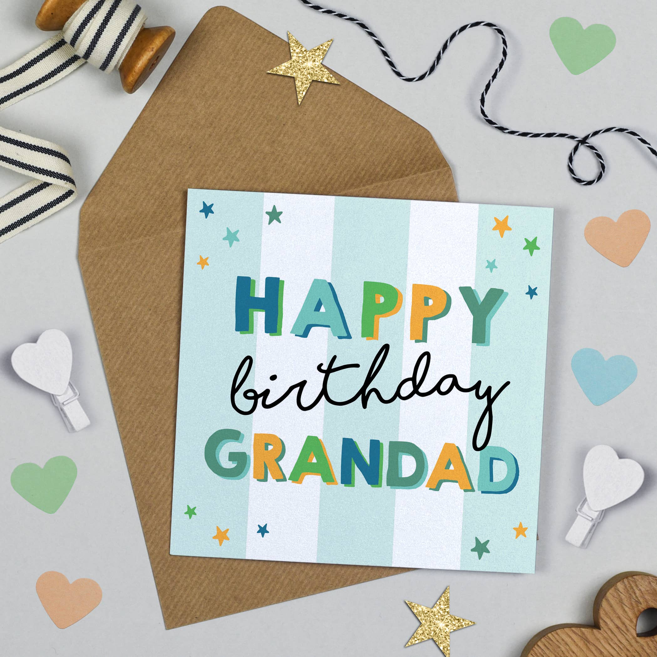 Happy Birthday Dad card with contemporary colourful and stylish typography. Striking pastel blue candy stripe design, digitally printed on luxury card with stunning gold foil finish. Send your dear Dad a gorgeous greeting with this luxury square folding card. • 150mm x 150mm • Blank inside for your own message • Supplied with a square recycled envelope • Luxury 300gsm FSC-certified board • Designed and printed in the UK