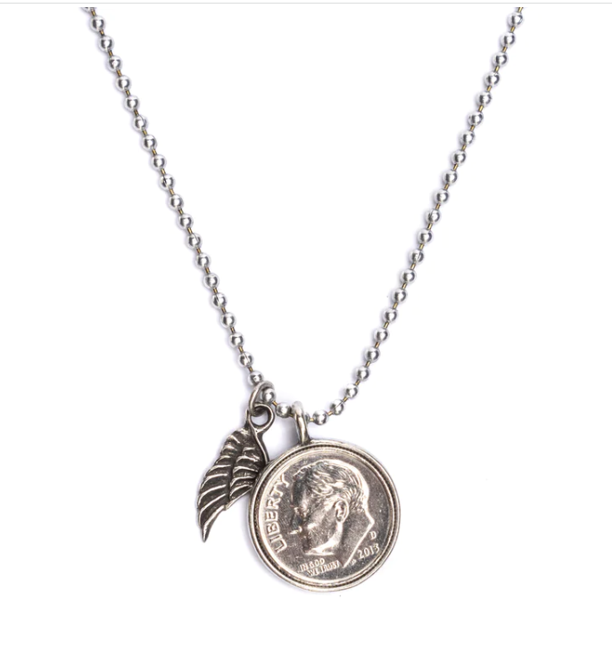18" dainty silver-plated chain necklace with petite yellow bronze penny charm . Card reads: This is my lucky penny, one I'd like to give to you It will not only bring you luck, it will help to see you through the times when you feel stuck or just a little blue. Whenever you feel like you're in a situation that you just can't win Pull out this Lucky Penny and make a simple wish. With this Lucky Penny in the palm of your hand, you will not only have good fortune but have a simple friend
