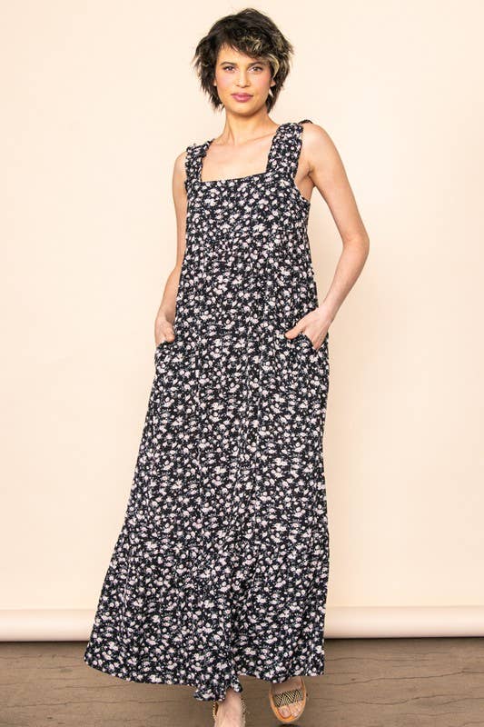 This women’s floral maxi dress captures an airy, romantic mood with its square neckline, smocked bodice, and soft handkerchief hem. Perfect for warm days or gentle transitions between seasons, it features half sleeves, side pockets, and an extra-wide flare in black, light green, and pale blue tones. Square Neck Smocked Chest Handkerchief Skirt Hem Half Sleeves Side Pockets Extra Wide Flare HPS Length: 54"