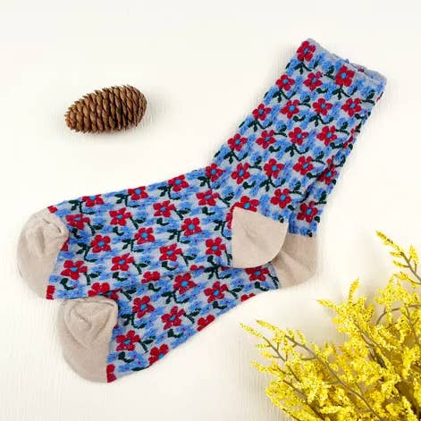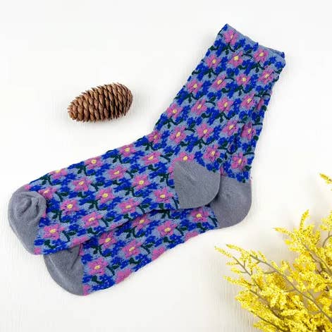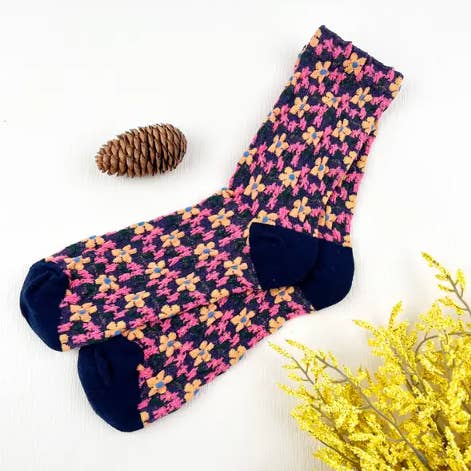 Navy Blue Embossed Floret Plant Long Socks