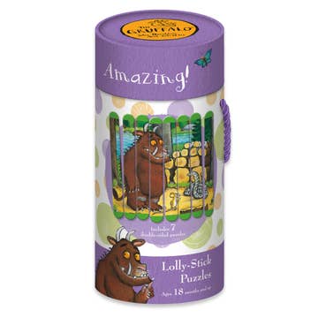 BEAUTIFUL DESIGN: Children will adore the iconic Gruffalo character artwork that is on this charming lolly stick puzzle set. PERFECT BEGINNER PUZZLE: Little ones will love developing their puzzle solving skills with this fun lolly stick puzzle featuring fourteen cheerful scenes. The set makes seven double-sided puzzles. DESIGNED FOR YOUNG CHILDREN: The set comes with 56 double-sided lolly sticks with coloured tips for each cheerful scene. Children sort the sticks by the coloured tips to make each puzzle. DOUBLE-SIDED PUZZLE FUN: Each of the lolly sticks is double-sided so children can have twice the fun! Once all the seven puzzles are built children can build their own super long puzzle and use their imagination to create their own story.