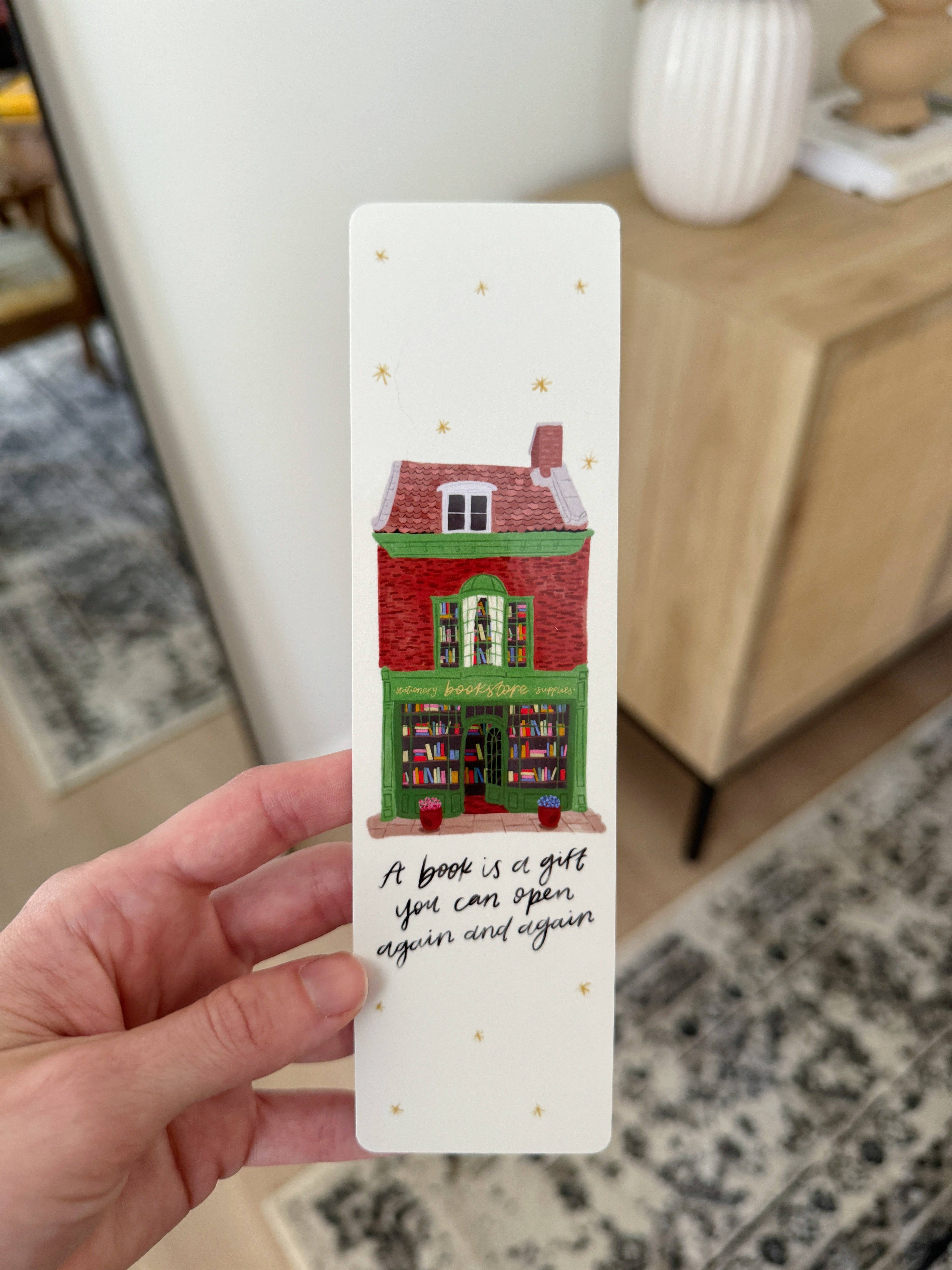 Perfect for book lovers and tea enthusiasts alike, this hand-drawn watercolor bookmark features a cozy scene of books on bookshelves, teacups, a teapot, and delicious cakes. Whether you're marking your spot in a novel, journaling, or gifting it to a fellow bookworm, this bookmark is a charming and functional accessory My bookmarks are all hand drawn and created by me! I print, cut and package every single bookmark myself in my home studio for a unique greeting card you can't find anywhere else Size: Approximately 2x7.25in Printed on glossy paper and laminated to ensure bookmark lasts forever Rights remain with Shea Lettering You may not alter, add filters, or change this bookmark in any way You may not sell, loan, or redistribute this design