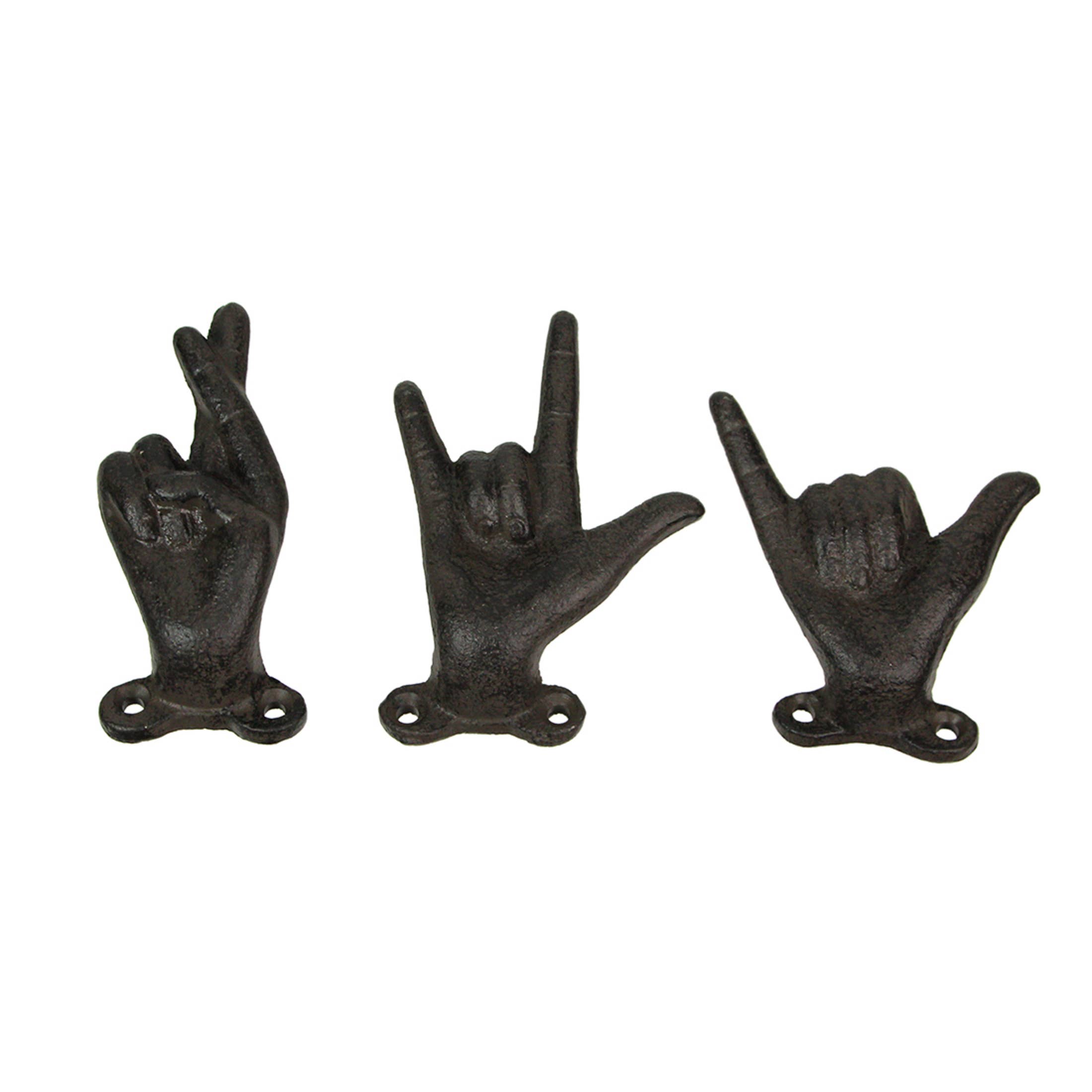 Add some rockin, peaceful, and attitude filled style to your home with this set of three cast iron hand gesture wall hooks The durable cast iron construction in a gold distressed finish gives them a touch of rustic contemporary character and sturdy durability. Two pre-drilled mounting holes make them easy to attach to almost any surface in minutes. They're perfect for holding keys, jewelry, towels, the pet's leash and so much more. Use them in any room to add a unique perspective to any space. The peace sign measures 2 inch long, 1.5 inch wide, 4 inch high; the rock-on horns measure 2 inch long, 1.75 inch wide, 4 inch high; the bird measures 2 inch long, 2 inch wide, 4 inch high. Makes a fun addition to your home or a as a gift for friends and family.