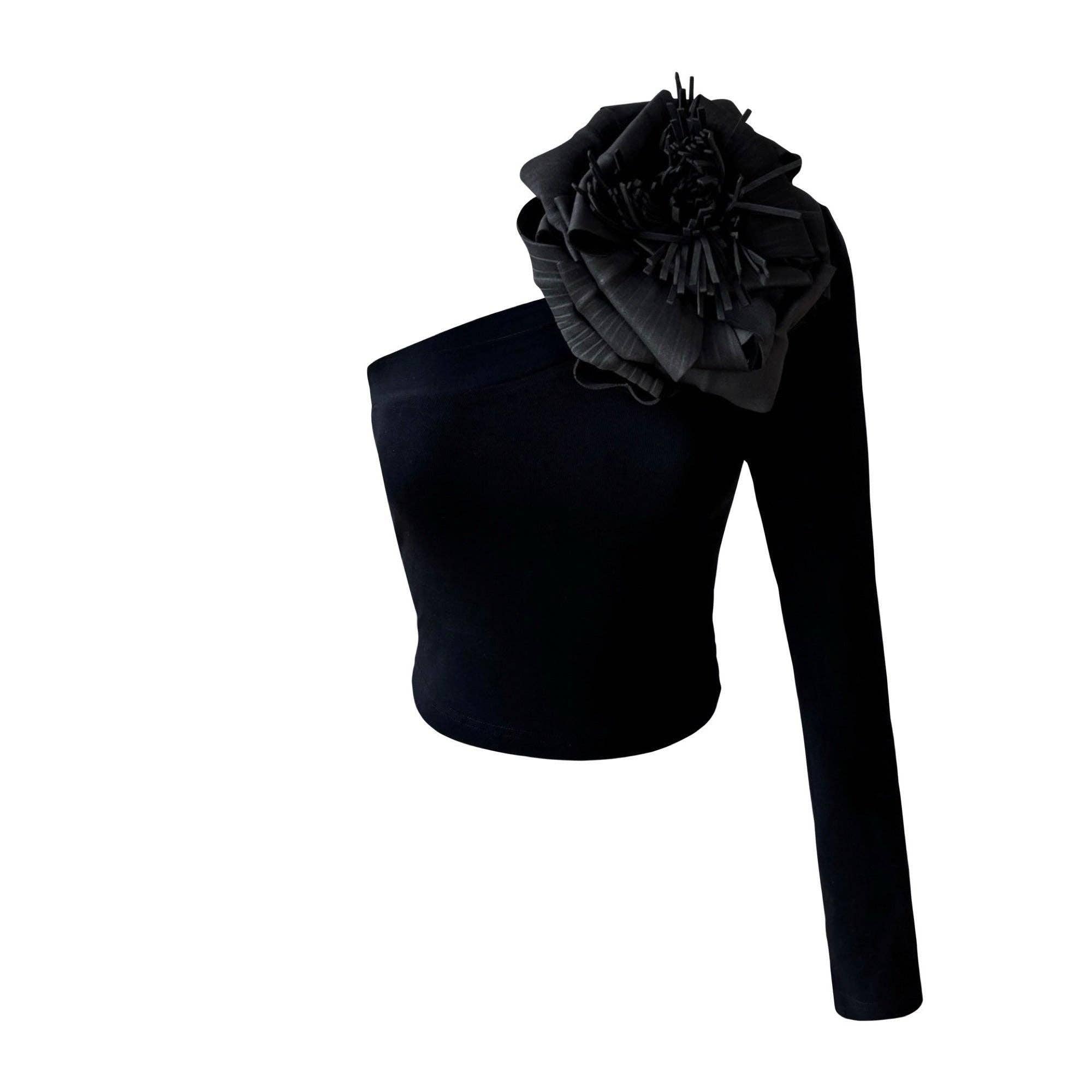 A striking asymmetrical top featuring a black and white stripe pattern, completed with a statement red flower pin, which is also detachable. The cotton fabric offers comfort with a touch of stretch. Details Material: 96% Cotton, 4% Elastane Detachable flower pin (40cm wide) Pin made from neoprene foam with wired petals Size: Available in S, M, L Stretchy fabric adapts between sizes Model wears size S and is 5'7" ft Care: Dry clean only Check the last photo for the size chart and exact measurements