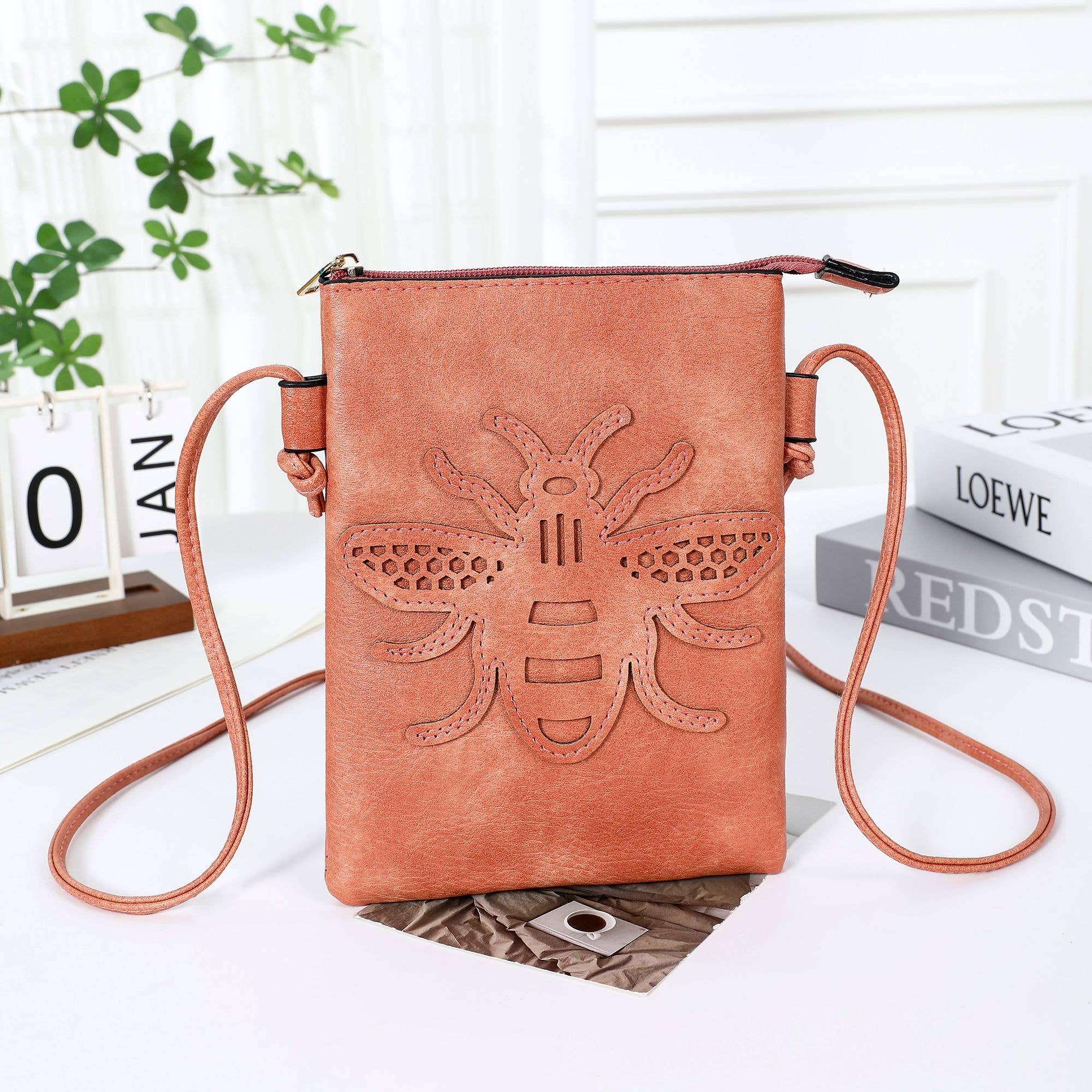 Product Features Made of high-quality faux leather MEASUREMENTS- 5.8 in W x 8 in H x 0.7 in D Handle drop- 24 in Textured woven design Top zipper closure Back pocket for cellphone