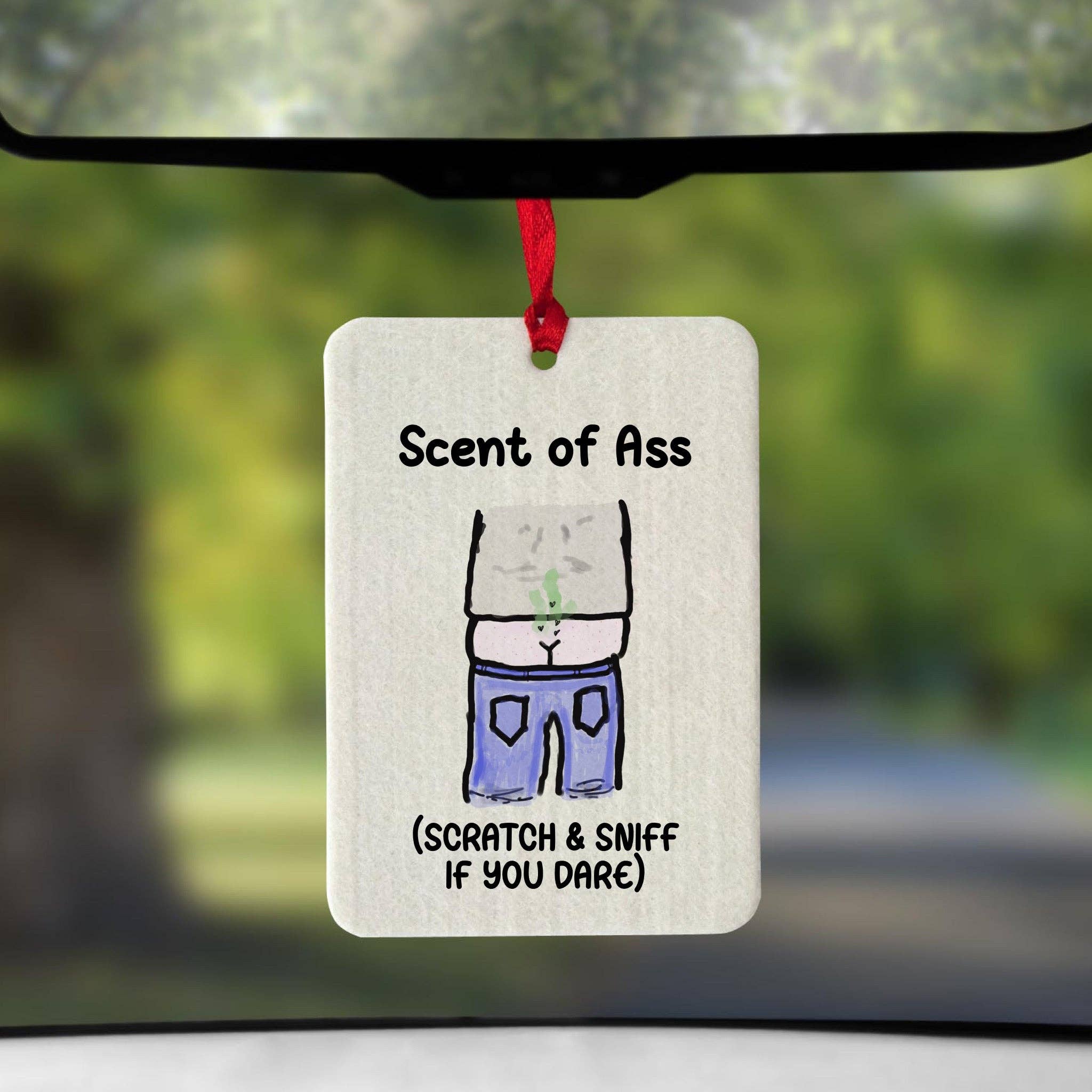 Material: Card, Polypropylene, Elastic, Absorbant Paper, and Fragrance Fragrance: Cherry Safety Information: Keep away from children. Full safety and fragrance information is shown on the product packaging. Do not rest or lean against any surface as the oils in the air freshener can cause staining or damage.