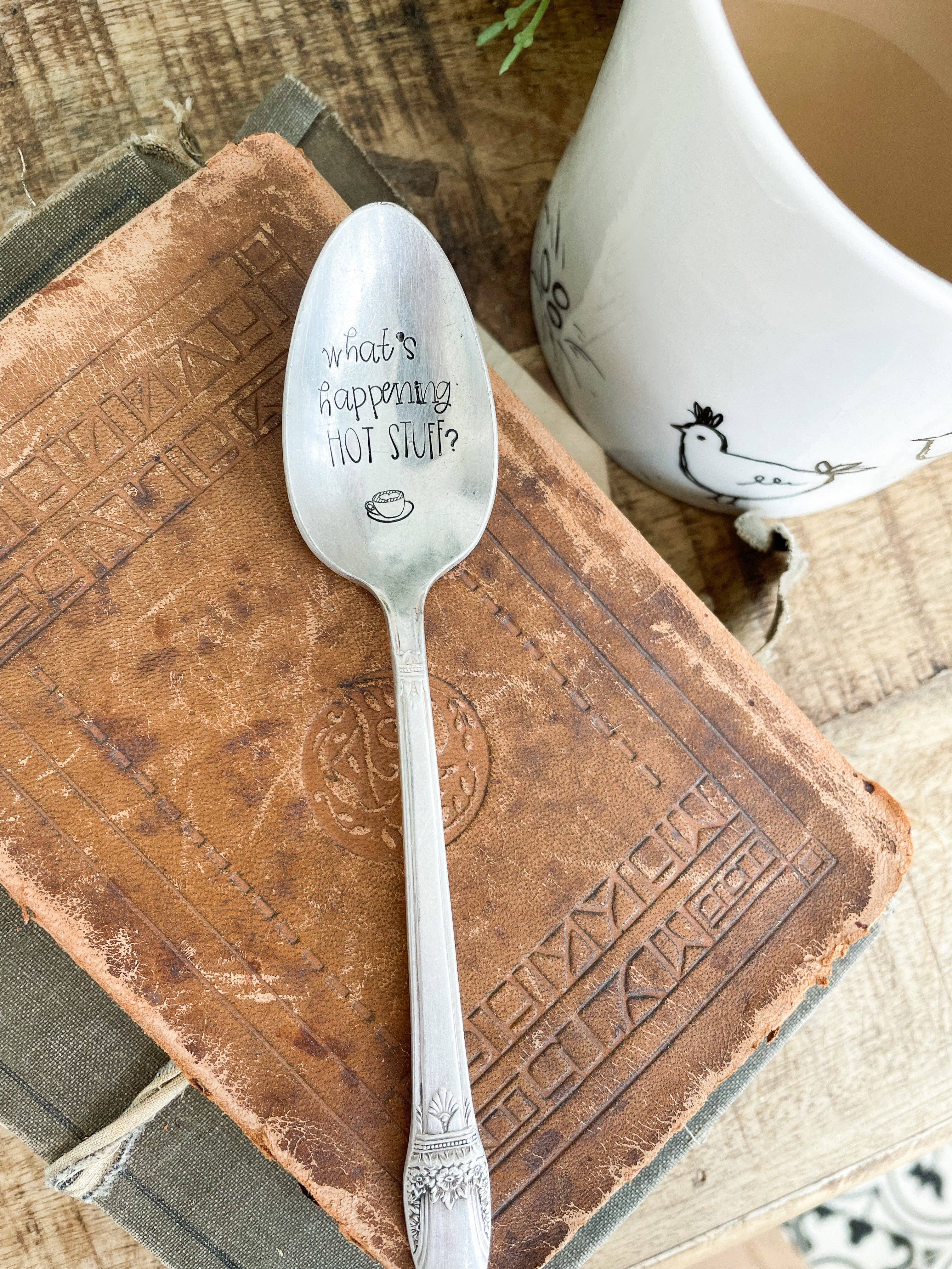Hand stamped “Instant human just add coffee” with a coffee cup, spoon & steam. This is for ONE spoon! These are vintage spoons so there will be imperfections! They may not resemble the same spoons in the picture either as those are examples. They are hammered and stamped with the wording. Spoons will vary in size. color and metal (meaning patina or tarnish). Each spoon will be different which adds to the uniqueness of this set. PLEASE NOTE! These are very old spoons and should be wiped clean with a damp rag. They should not be placed in the dishwasher or be soaked in any water as it can ruin the metal/ wording. Every effort is made to ensure the item you receive matches the photos displayed, there may be some slight variations. Variations in color may also occur based on computer monitor settings.