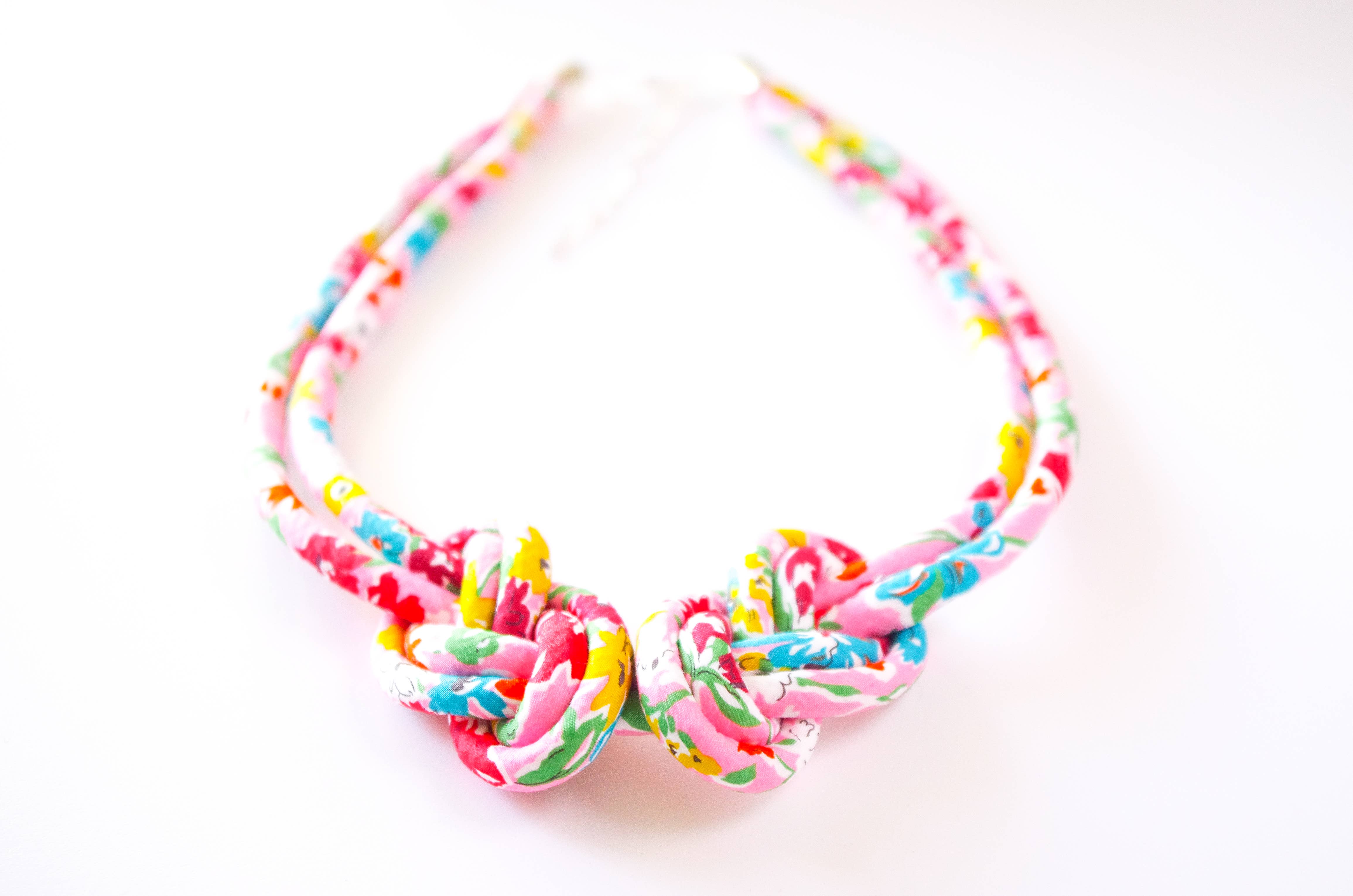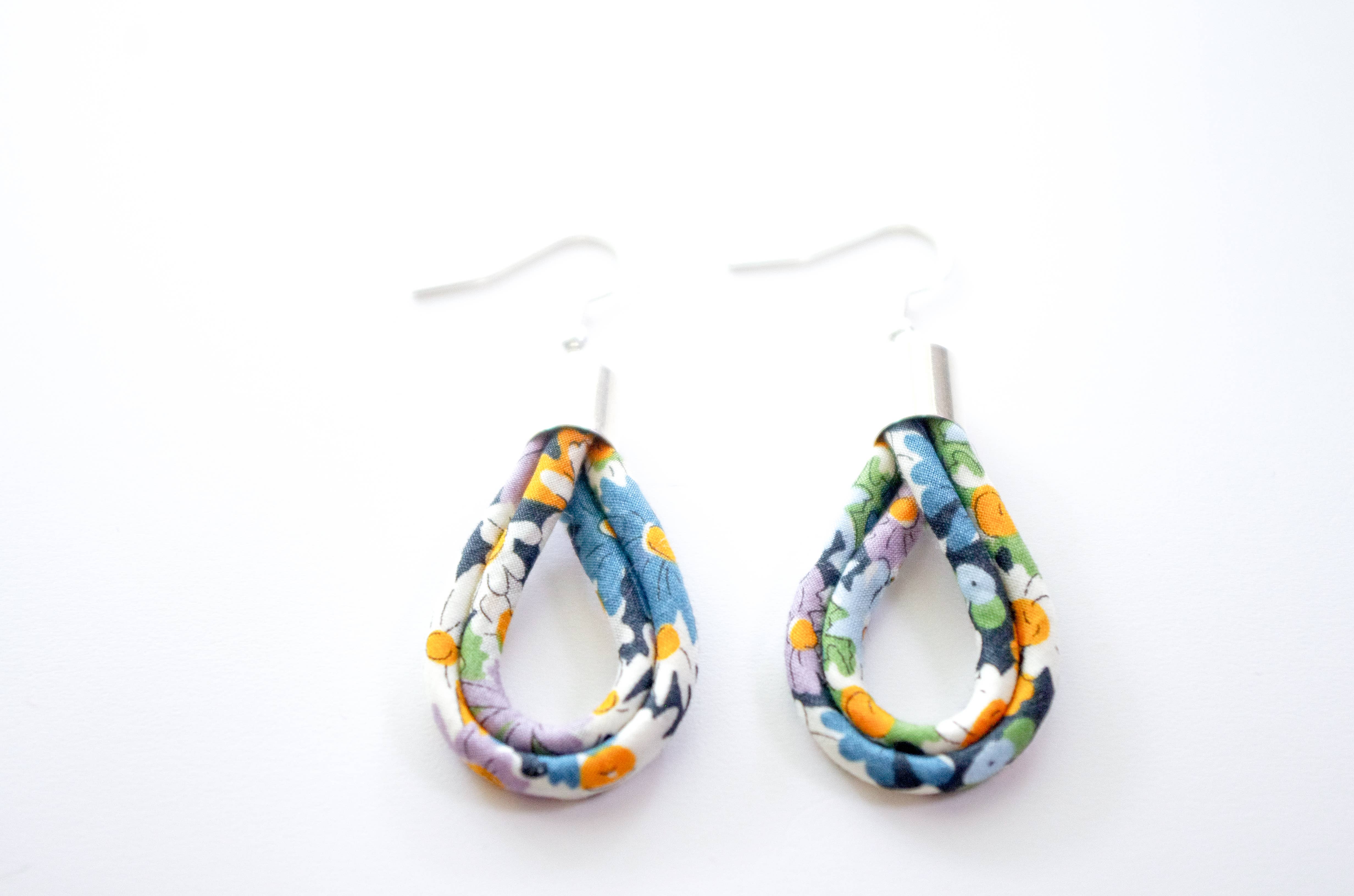 Floral print Liberty fabric knotted earrings made using a colourful fabric covered cord. All earrings are finished with silver plated findings and fish hook earwires that are lead and nickel free. There is a choice of three prints in this collection; Libby - a classic delicate Liberty floral design in blue, lilac and yellow created in the 1930's. Gloria Lomo - a bright, modern imagining of a bold 30's floral. California Bloom - a loosely drawn brightly coloured floral from the seventies but reminiscent of 1930's fashion florals. The knots are constructed of two individual pieces of hand-covered cord and are around 2.5cm long. The total length from the top curve of the fish hook to the bottom of the knot is 5.5cm. The cord section measures just under 2cm across at the widest part. The silver end caps are 7mm diameter. Delivered with a two piece hand stamped recycled card gift box.