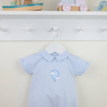 Beautiful blue and white striped shortie for baby boys. Made in soft cotton, the upper part is in a ribbed fabric and the lower part is in lightweight poplin. With blue embroidered rocking horse on the chest, with buttons on the back for fastening.