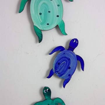Laser-cut from sturdy 14 gauge steel, these hand-painted turtle magnets will brighten up any fridge or classroom. These magnets are super strong! Each piece is individually hand-painted and signed. Minor variations will occur. Rust-resistant primer and a clear coat finish make them extremely durable, too. Artist's bio is included. Please specify color.