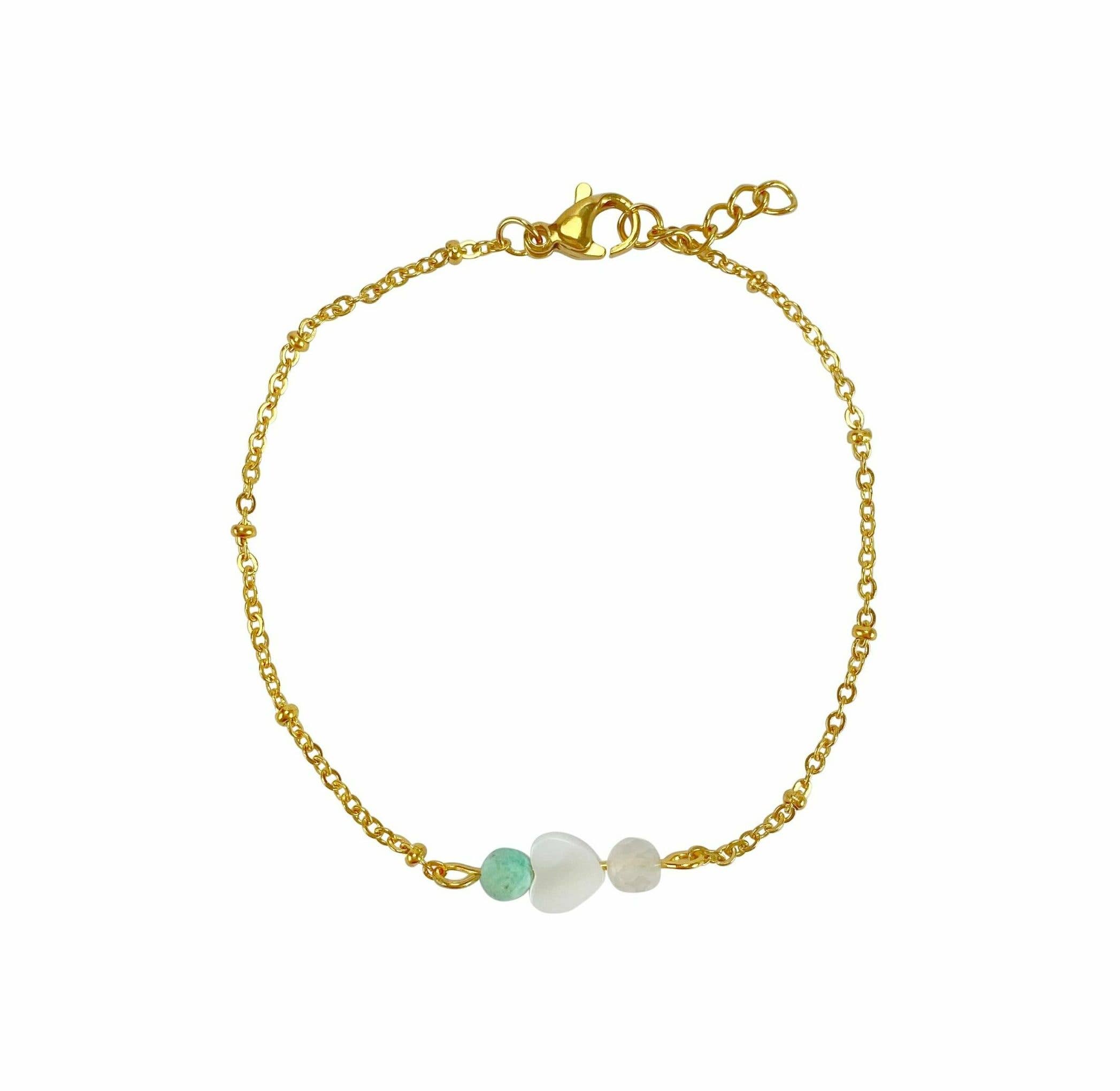 Stainless steel bracelet with 3 tourmaline gemstones and a bow charm. Size: 17.5 cm + extra length