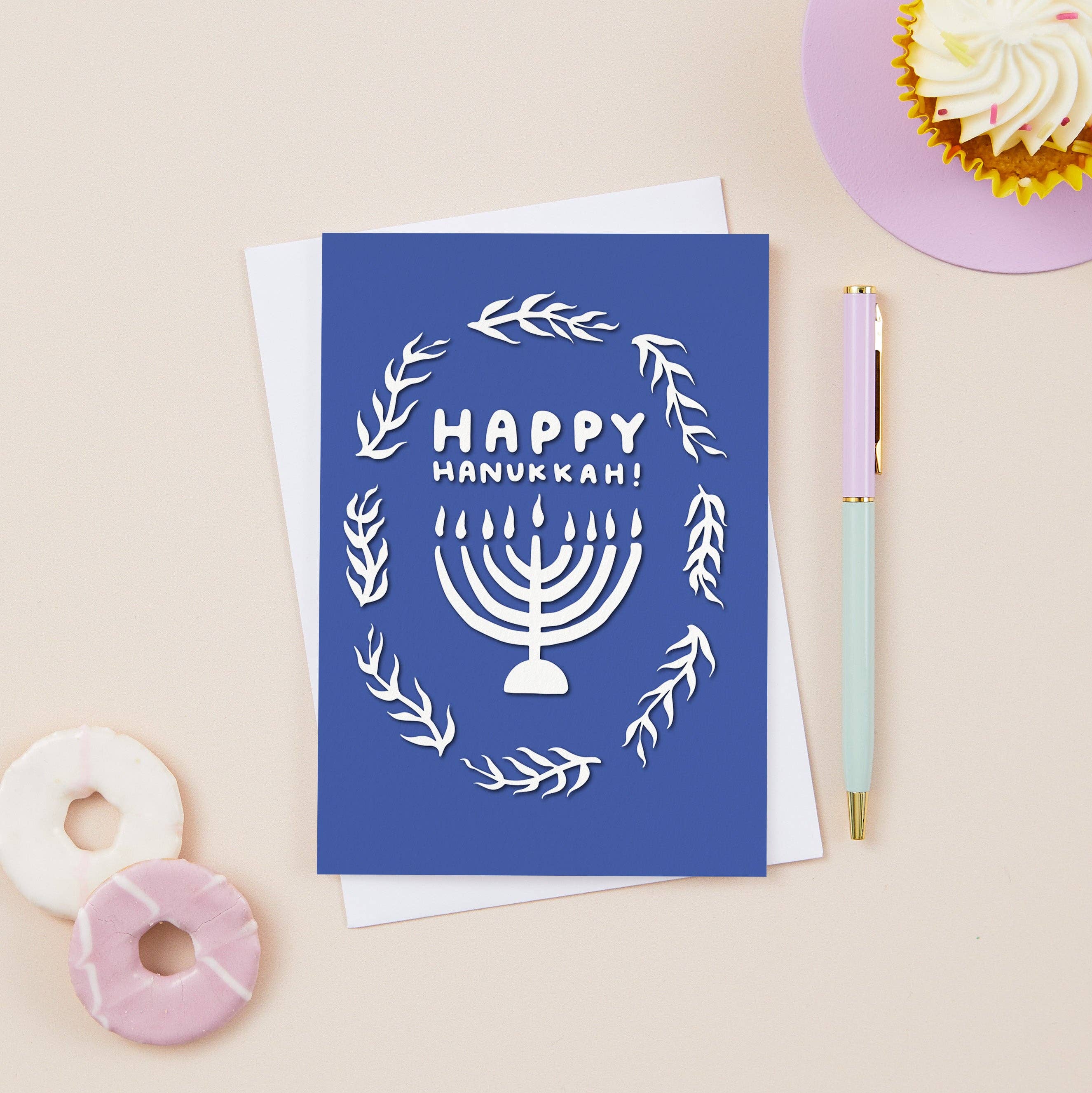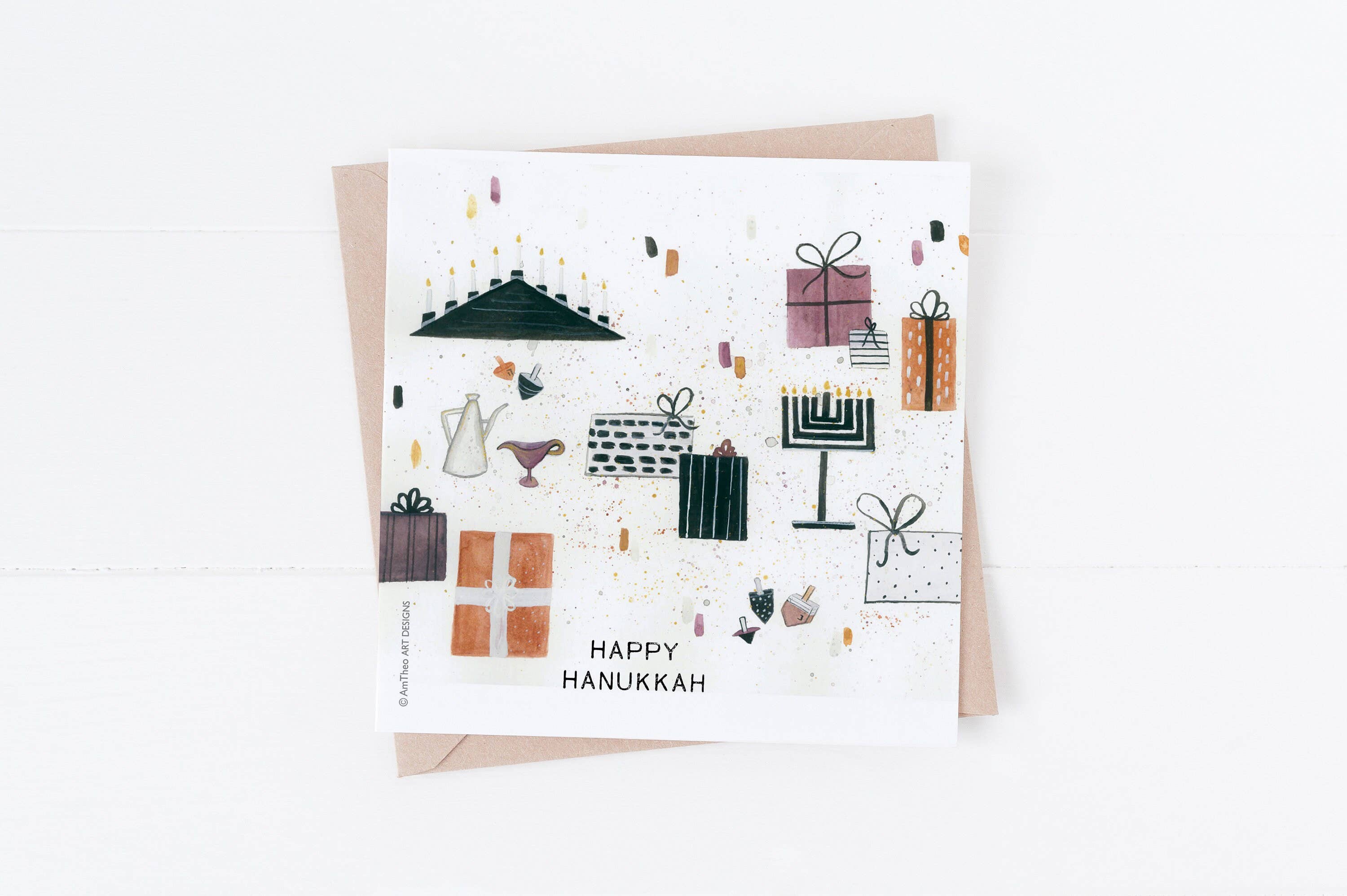 "Warm & Fuzzy Hanukkah Wishes" handlettering with a watercolor illustration of a cute rabbit wearing a Hanukkah sweater. A2 card with an original watercolor illustration printed on 130 lb paper. Comes with a blue deep-flap paper envelope in a protective cellophane sleeve. Size: A2 (4.25" x 5.5")